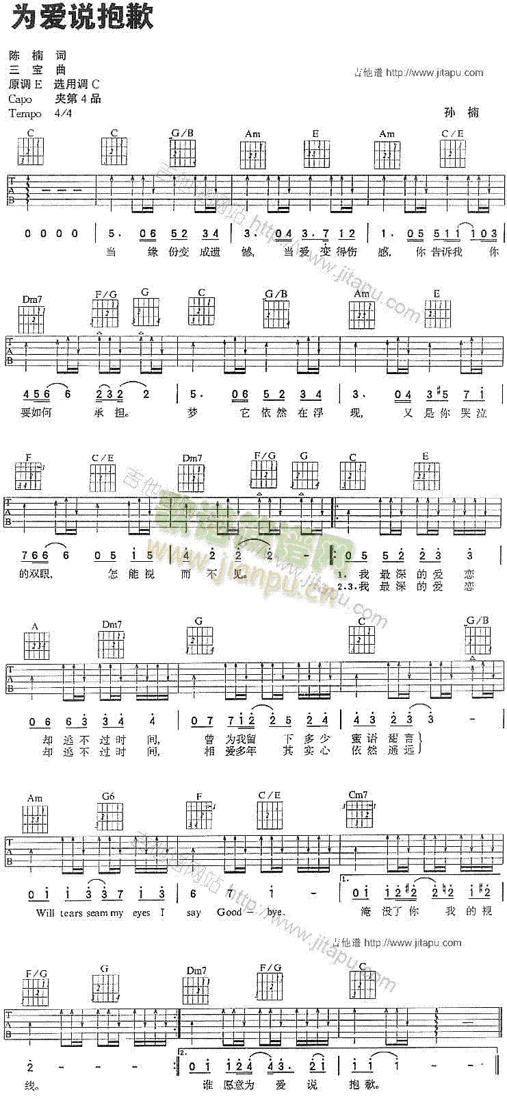 公众号:绵羊乐谱 为爱说抱歉免费弹唱吉他谱_六线谱:孙楠 点击: 1000 图片可能经过缩放,手机长按或点开后长按保存,电脑鼠标右键保存. (网络) 公众号:绵羊乐谱 | 官方QQ群:978773290 不吃独食,学会分享!本文链接:http://www.shaomingyang.com/btb/17867.html 转载请标明出处,尊重原创(๑╹◡╹)ノ。如信息有误或版权疑问,请通过网站底部联系我们会第一时间处理,感谢理解支持(◕ᴗ◕✿)!