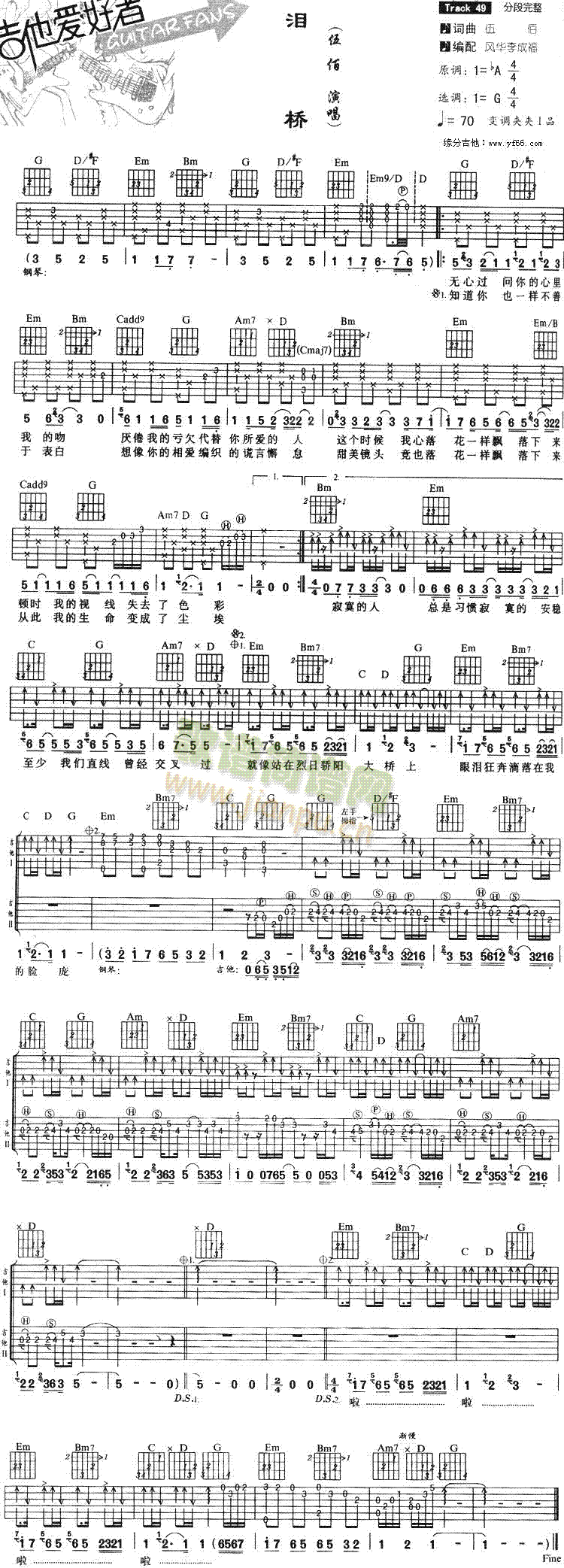 公众号:绵羊乐谱 泪桥免费弹唱吉他谱_六线谱:伍佰 点击: 1000 图片可能经过缩放,手机长按或点开后长按保存,电脑鼠标右键保存. (网络) 公众号:绵羊乐谱 | 官方QQ群:978773290 不吃独食,学会分享!本文链接:http://www.shaomingyang.com/btb/18149.html 转载请标明出处,尊重原创(๑╹◡╹)ノ。如信息有误或版权疑问,请通过网站底部联系我们会第一时间处理,感谢理解支持(◕ᴗ◕✿)!