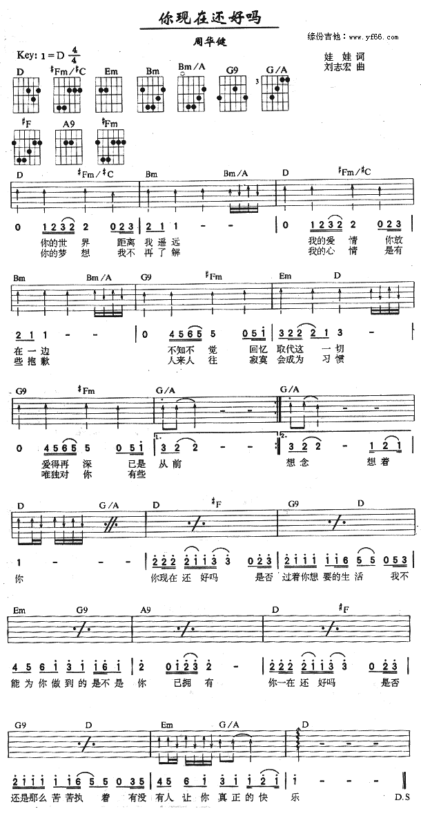 公众号:绵羊乐谱 你现在还好吗免费弹唱吉他谱_六线谱:周华健 点击: 1000 图片可能经过缩放,手机长按或点开后长按保存,电脑鼠标右键保存. (网络) 公众号:绵羊乐谱 | 官方QQ群:978773290 不吃独食,学会分享!本文链接:http://www.shaomingyang.com/btb/19139.html 转载请标明出处,尊重原创(๑╹◡╹)ノ。如信息有误或版权疑问,请通过网站底部联系我们会第一时间处理,感谢理解支持(◕ᴗ◕✿)!