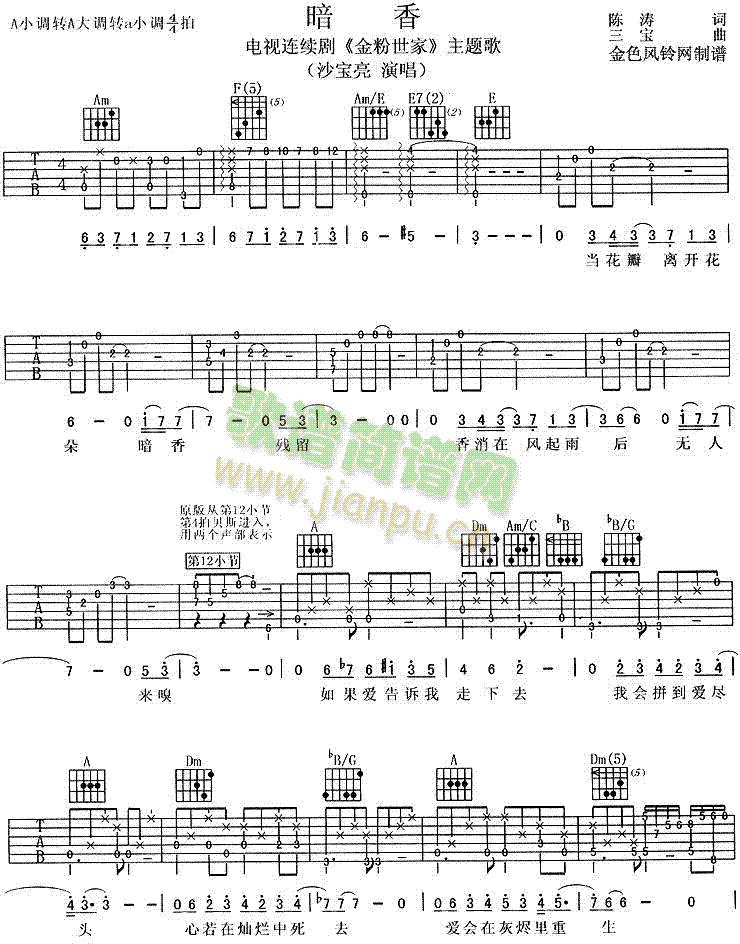 公众号:绵羊乐谱 暗香(《金粉世家》主题歌)免费弹唱吉他谱_六线谱:沙宝亮 点击: 1000 图片可能经过缩放,手机长按或点开后长按保存,电脑鼠标右键保存. (金色风铃网) 公众号:绵羊乐谱 | 官方QQ群:978773290 不吃独食,学会分享!本文链接:http://www.shaomingyang.com/btb/22323.html 转载请标明出处,尊重原创(๑╹◡╹)ノ。如信息有误或版权疑问,请通过网站底部联系我们会第一时间处理,感谢理解支持(◕ᴗ◕✿)!
