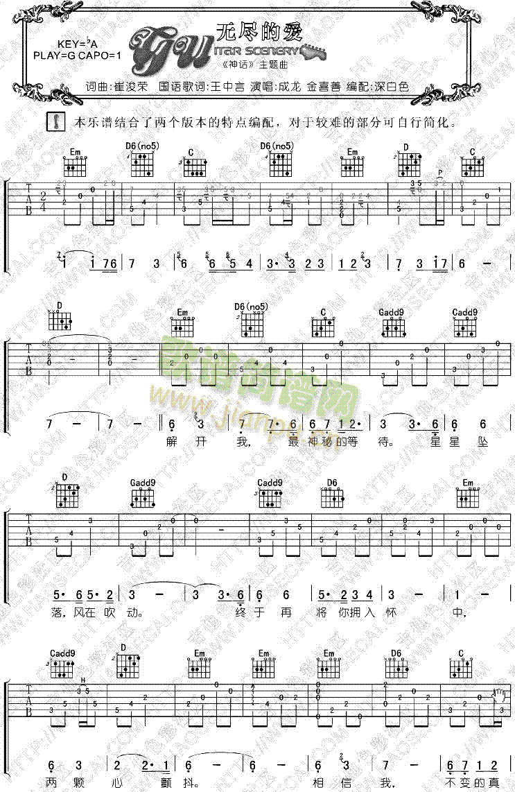 公众号:绵羊乐谱 无尽的爱(美丽的神话《神话》主题曲)免费弹唱吉他谱_六线谱:成龙、金喜善 点击: 1000 图片可能经过缩放,手机长按或点开后长按保存,电脑鼠标右键保存. (网友深白色提供) 公众号:绵羊乐谱 | 官方QQ群:978773290 不吃独食,学会分享!本文链接:http://www.shaomingyang.com/btb/22552.html 转载请标明出处,尊重原创(๑╹◡╹)ノ。如信息有误或版权疑问,请通过网站底部联系我们会第一时间处理,感谢理解支持(◕ᴗ◕✿)!