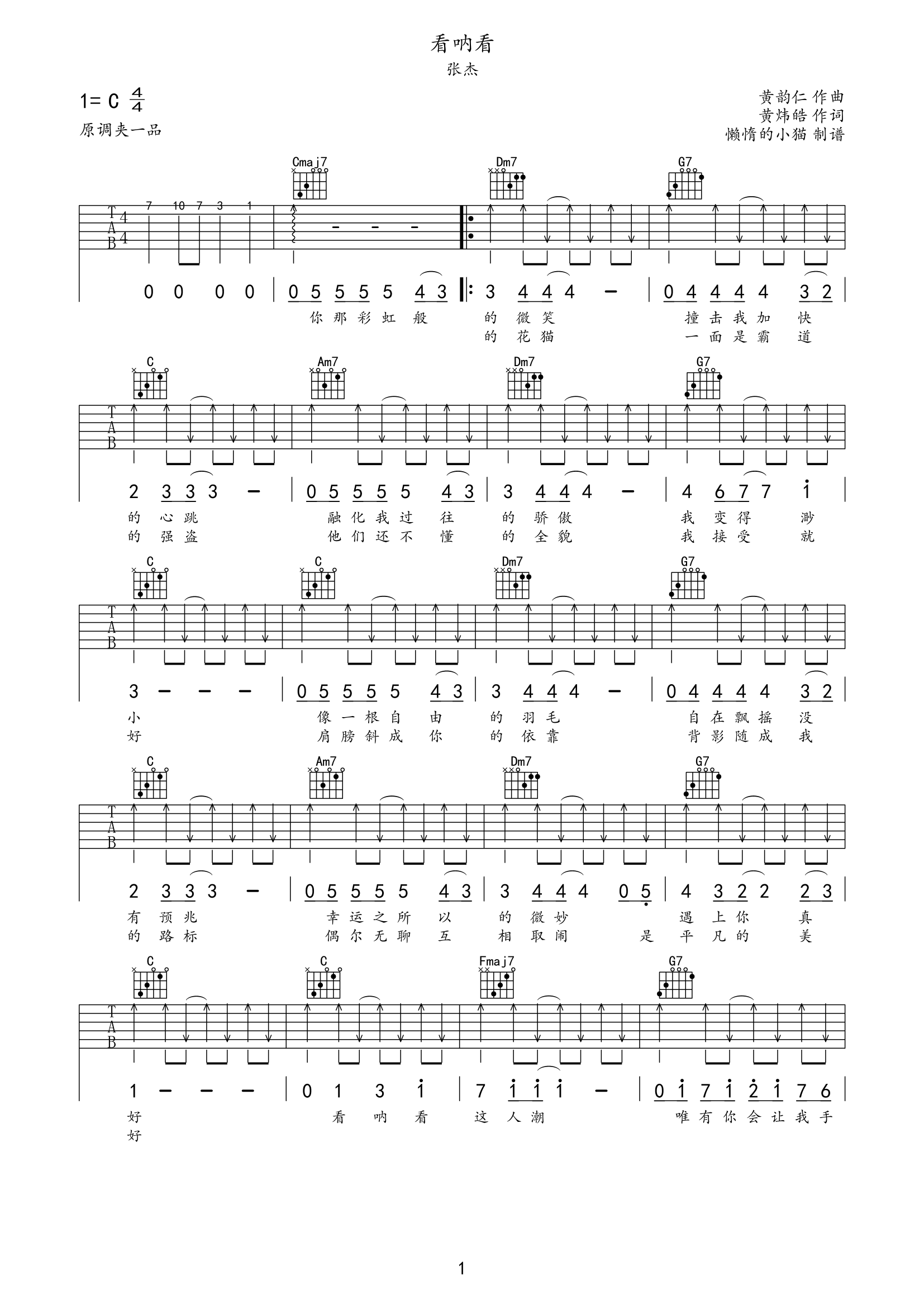 本文题目 看呐看吉他谱 张杰(C调) 吉他图片谱2张 ,本文网址