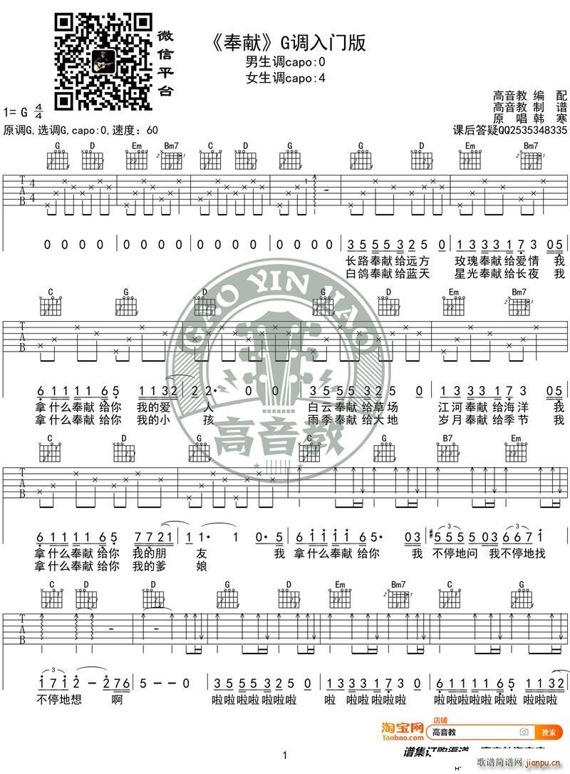 公众号:绵羊乐谱 《奉献》 G调入门版 韩寒 高音教编配免费弹唱吉他谱_六线谱/词曲: 点击: 1000 图片可能经过缩放,手机长按或点开后长按保存,电脑鼠标右键保存. (网络) 公众号:绵羊乐谱 | 官方QQ群:978773290 不吃独食,学会分享!本文链接:http://www.shaomingyang.com/btb/29710.html 转载请标明出处,尊重原创(๑╹◡╹)ノ。如信息有误或版权疑问,请通过网站底部联系我们会第一时间处理,感谢理解支持(◕ᴗ◕✿)!