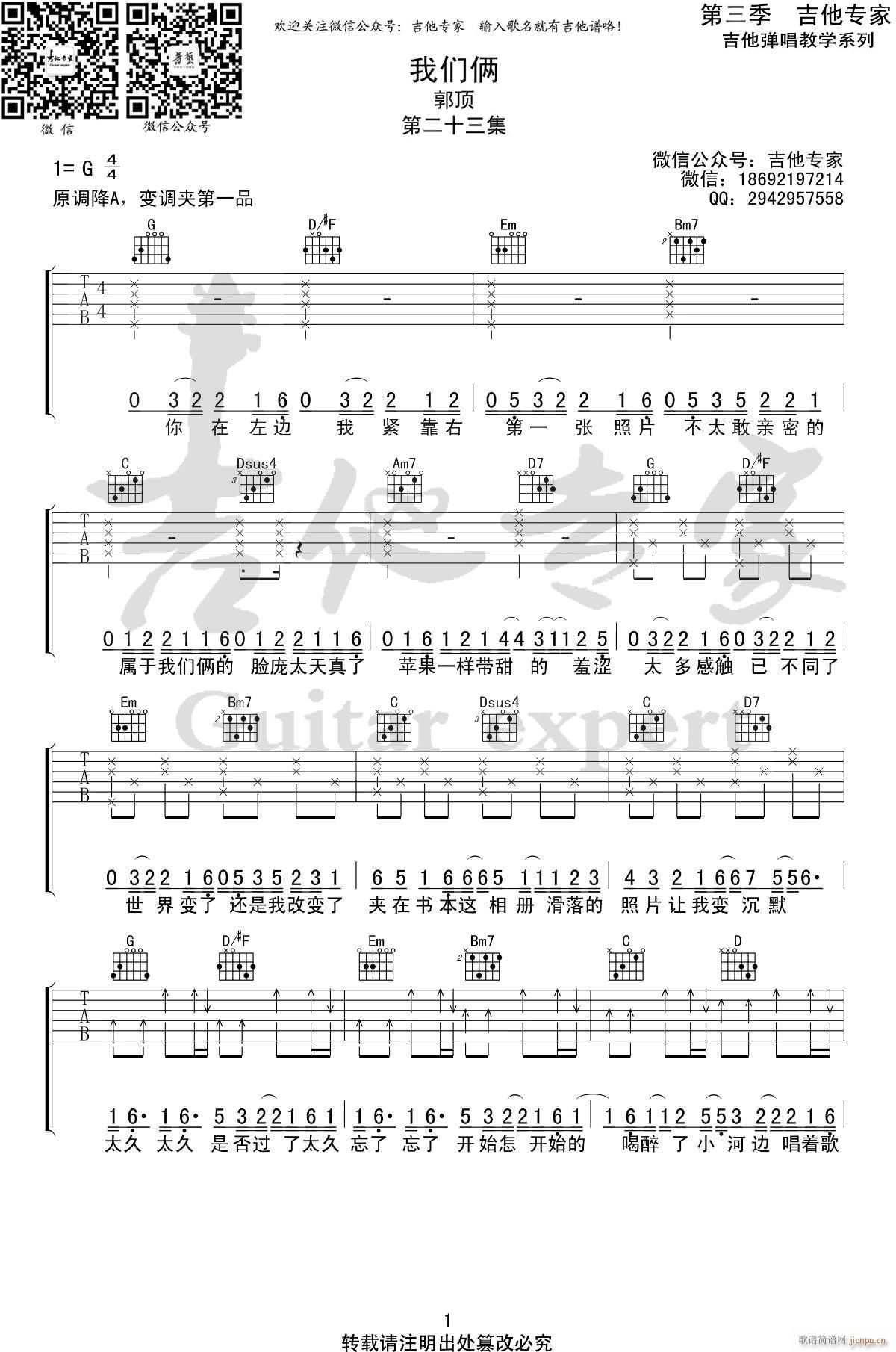 公众号:绵羊乐谱 我们俩 ( G调指法原版编配)免费弹唱吉他谱_六线谱/词曲:郭顶 点击: 1000 图片可能经过缩放,手机长按或点开后长按保存,电脑鼠标右键保存. (吉他专家) 公众号:绵羊乐谱 | 官方QQ群:978773290 不吃独食,学会分享!本文链接:http://www.shaomingyang.com/btb/29775.html 转载请标明出处,尊重原创(๑╹◡╹)ノ。如信息有误或版权疑问,请通过网站底部联系我们会第一时间处理,感谢理解支持(◕ᴗ◕✿)!