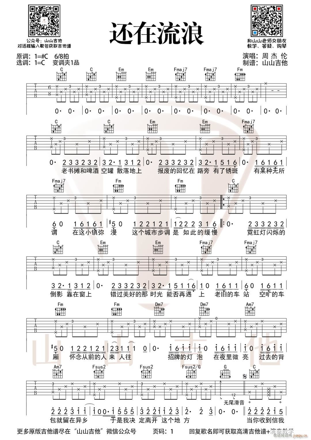 公众号:绵羊乐谱 还在流浪 ( C调原版 )免费弹唱吉他谱_六线谱/词曲:周杰伦 点击: 1000 图片可能经过缩放,手机长按或点开后长按保存,电脑鼠标右键保存. (山山吉他) 公众号:绵羊乐谱 | 官方QQ群:978773290 不吃独食,学会分享!本文链接:http://www.shaomingyang.com/btb/29814.html 转载请标明出处,尊重原创(๑╹◡╹)ノ。如信息有误或版权疑问,请通过网站底部联系我们会第一时间处理,感谢理解支持(◕ᴗ◕✿)!