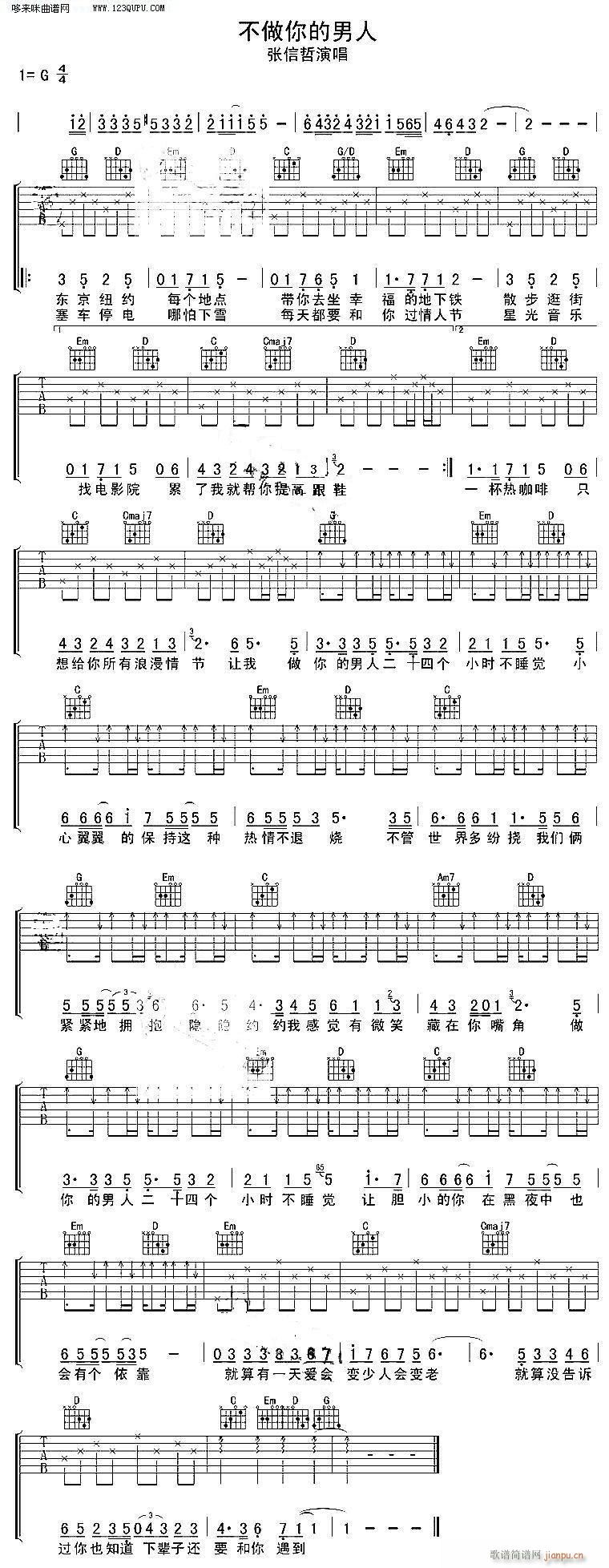 公众号:绵羊乐谱 不做你的男人免费弹唱吉他谱_六线谱/词曲:张信哲 点击: 1000 图片可能经过缩放,手机长按或点开后长按保存,电脑鼠标右键保存. (网络) 公众号:绵羊乐谱 | 官方QQ群:978773290 不吃独食,学会分享!本文链接:http://www.shaomingyang.com/btb/29954.html 转载请标明出处,尊重原创(๑╹◡╹)ノ。如信息有误或版权疑问,请通过网站底部联系我们会第一时间处理,感谢理解支持(◕ᴗ◕✿)!