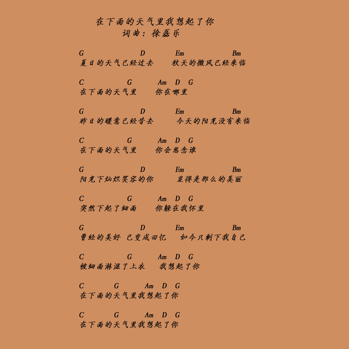公众号:绵羊乐谱 在下雨的天气里我想起了你免费弹唱吉他谱_六线谱:徐磊乐 点击: 1000 图片可能经过缩放,手机长按或点开后长按保存,电脑鼠标右键保存. (乐友手指弹琴传谱) 公众号:绵羊乐谱 | 官方QQ群:978773290 不吃独食,学会分享!本文链接:http://www.shaomingyang.com/btb/29992.html 转载请标明出处,尊重原创(๑╹◡╹)ノ。如信息有误或版权疑问,请通过网站底部联系我们会第一时间处理,感谢理解支持(◕ᴗ◕✿)!