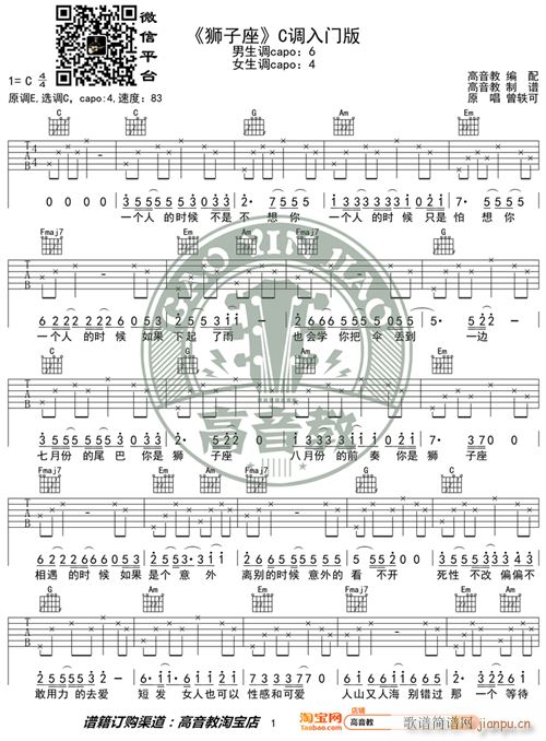 公众号:绵羊乐谱 《狮子座》 C调入门版 编配 猴哥吉他教学免费弹唱吉他谱_六线谱/词曲: 点击: 1000 图片可能经过缩放,手机长按或点开后长按保存,电脑鼠标右键保存. (高音教) 公众号:绵羊乐谱 | 官方QQ群:978773290 不吃独食,学会分享!本文链接:http://www.shaomingyang.com/btb/30042.html 转载请标明出处,尊重原创(๑╹◡╹)ノ。如信息有误或版权疑问,请通过网站底部联系我们会第一时间处理,感谢理解支持(◕ᴗ◕✿)!