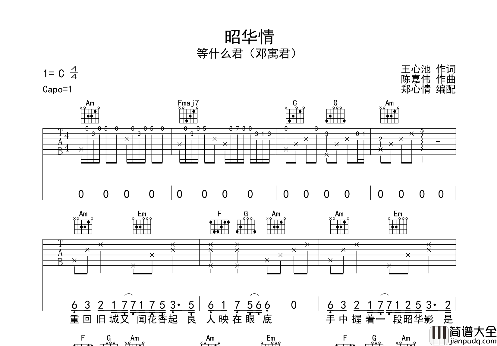 由@郑心情制谱的《昭华情》吉他谱,共3张高清图片谱例,选用C调指法编配,原调#C调,变调夹夹1品弹唱原调,节奏4/4拍,弹唱难度较简单。