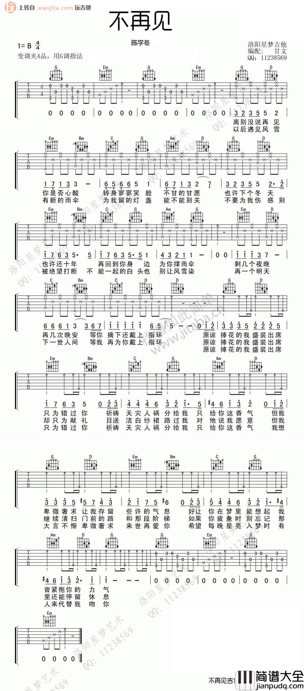 不再见吉他谱_B调高清图片谱是陈学冬演唱的《小时代3:刺金时代》的主题曲,这个版本吉他谱选用B调,用G调指法弹唱,变调夹夹在第四品,和弦比较简单,变换基本上不复杂,新手也可弹唱。刚好这是首洋溢着青春感伤的歌曲,歌名更是一语双关,既有不再见的意思,也表达不想说再见。《不再见》以悲伤舒缓的曲风引领全场观众重温那个“最好也是最坏”的时代。