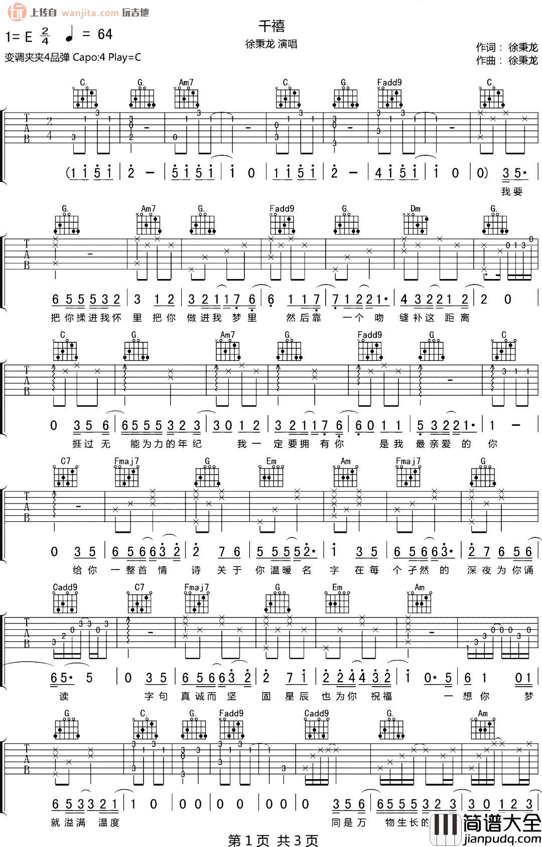 公众号:绵羊乐谱 千禧吉他弹唱谱,总共3张高清图片谱,原调E调,选用C调,变调夹夹4品。这首歌曲整体来说难度较高,不推荐新手学习,大家在练习的时候需要注意歌曲的和弦变化和节奏。 公众号:绵羊乐谱 | 官方QQ群:978773290 不吃独食,学会分享!本文链接:http://www.shaomingyang.com/btb/30428.html 转载请标明出处,尊重原创(๑╹◡╹)ノ。如信息有误或版权疑问,请通过网站底部联系我们会第一时间处理,感谢理解支持(◕ᴗ◕✿)!