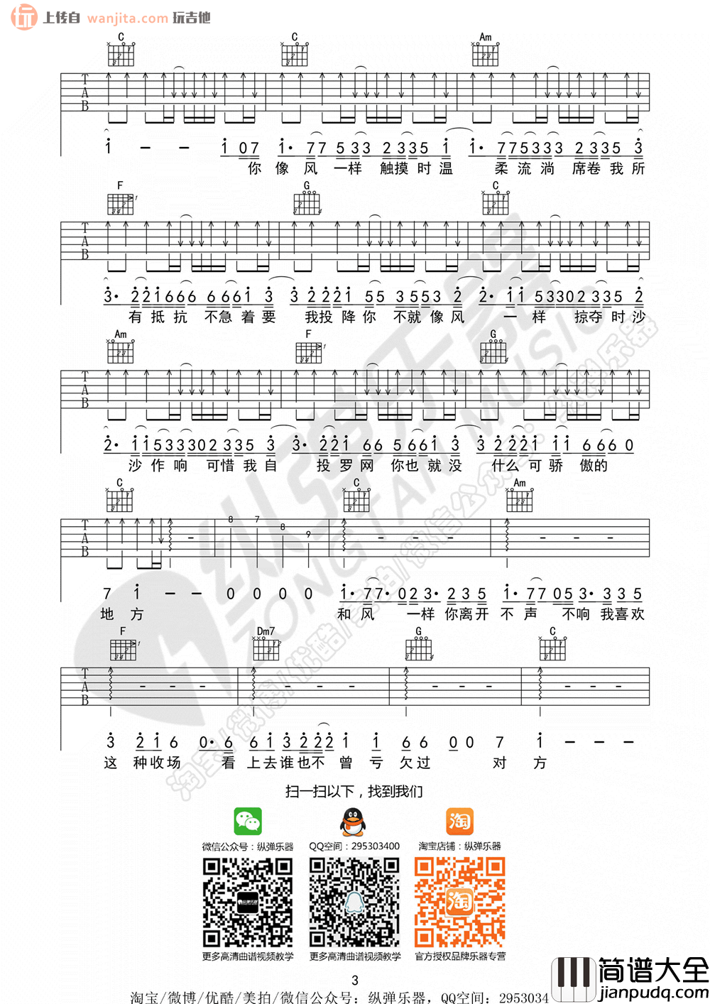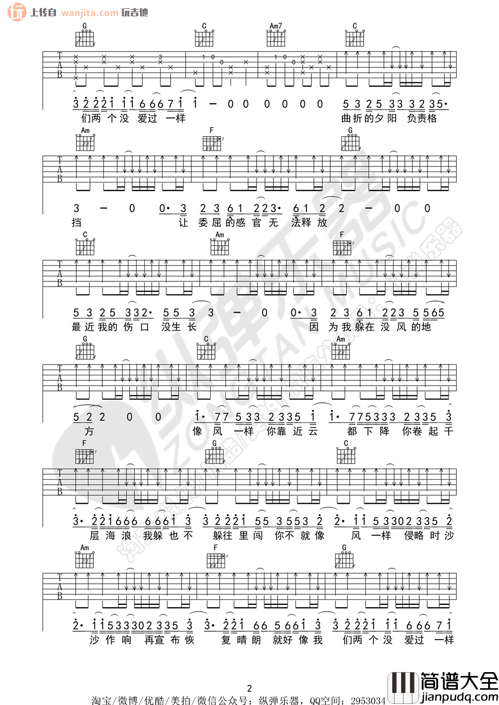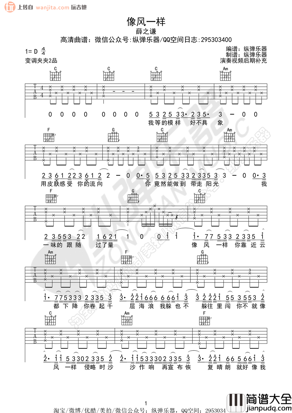 《像风一样》吉他谱,原调D调,变调夹夹2品。歌曲整体不算难,这首歌主要表达的是情感,经典的薛式情歌。所以吉他能很好地搭配这首歌,很适合吉他弹唱的一首流行伤感音乐。
