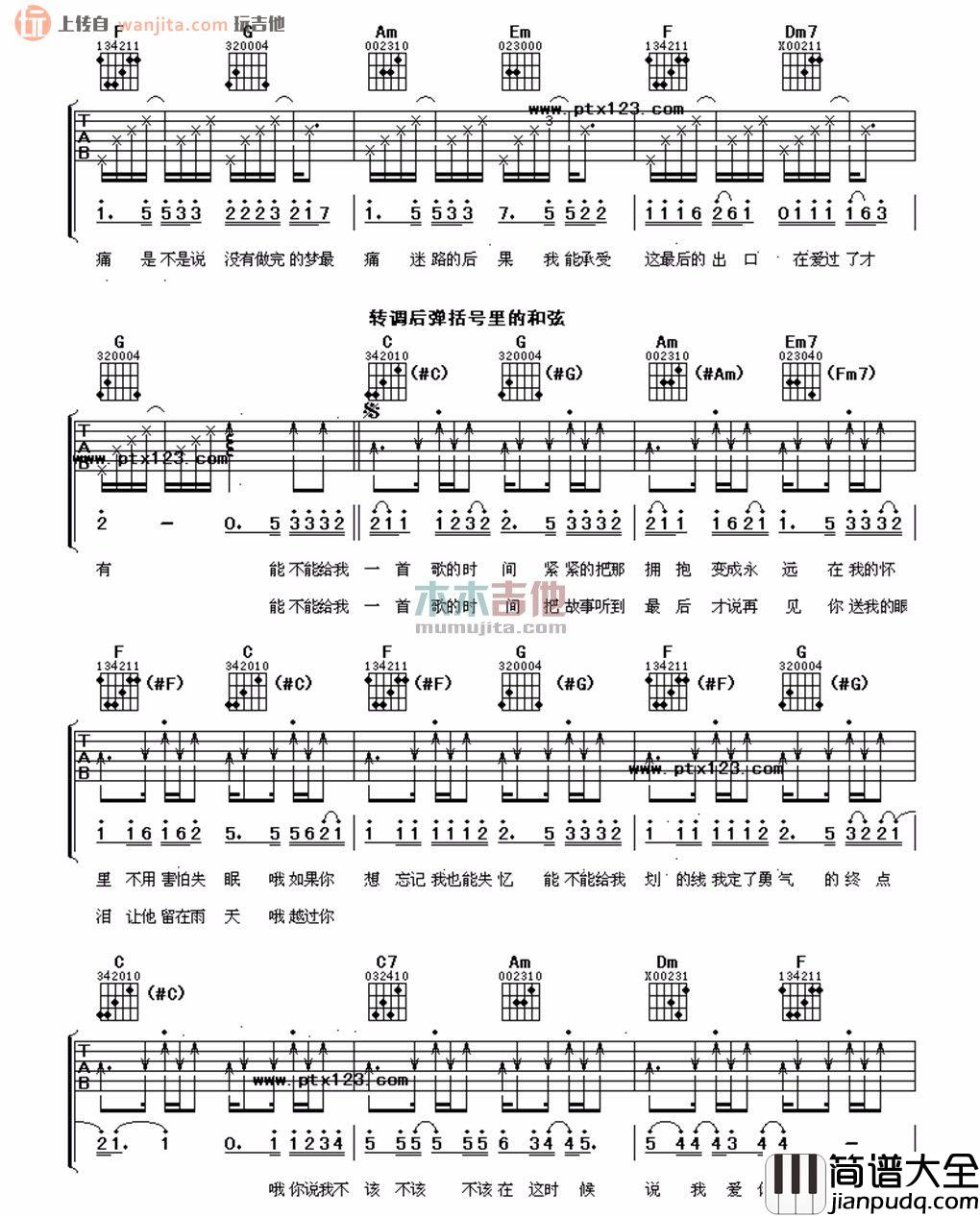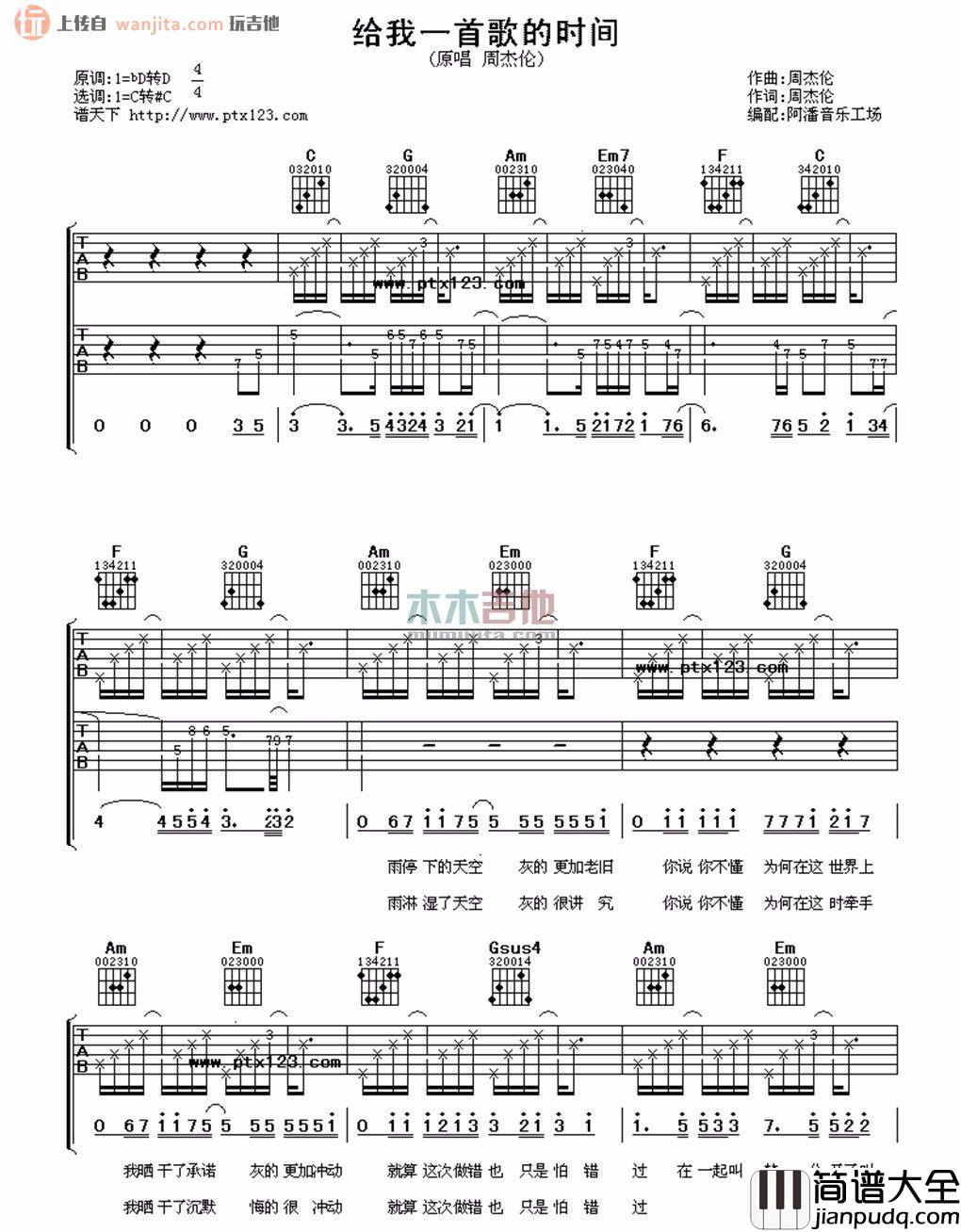 《给我一首歌的时间》吉他谱原调D,选用C调,不使用变调夹。这首很有周氏风格的情歌不管是从节奏上来说还是歌词的含义上来看,它更像是一件艺术品,需要我们怀着敬畏之心去学习,去了解。整张谱子难度适中,比较适合练习收藏。