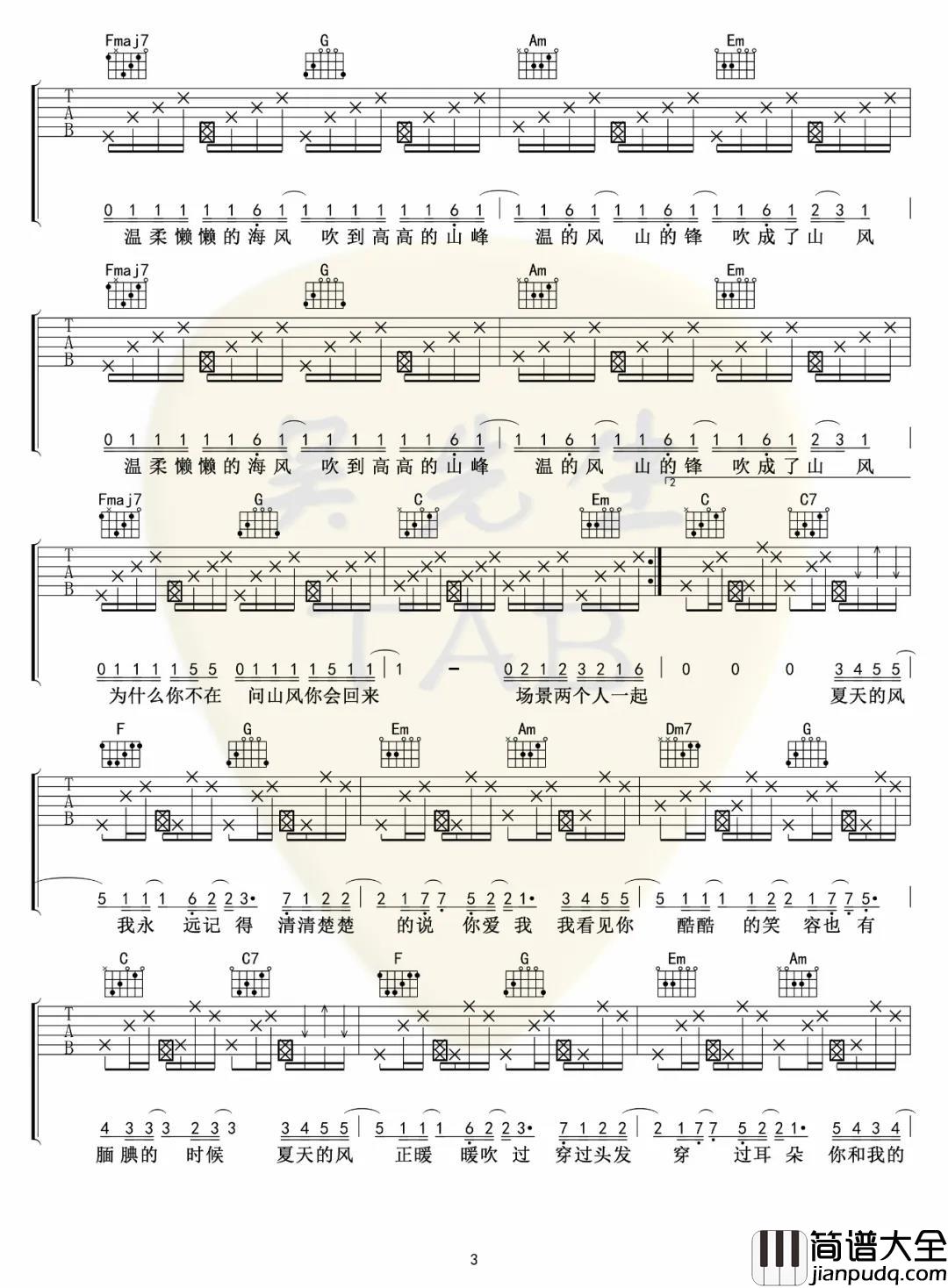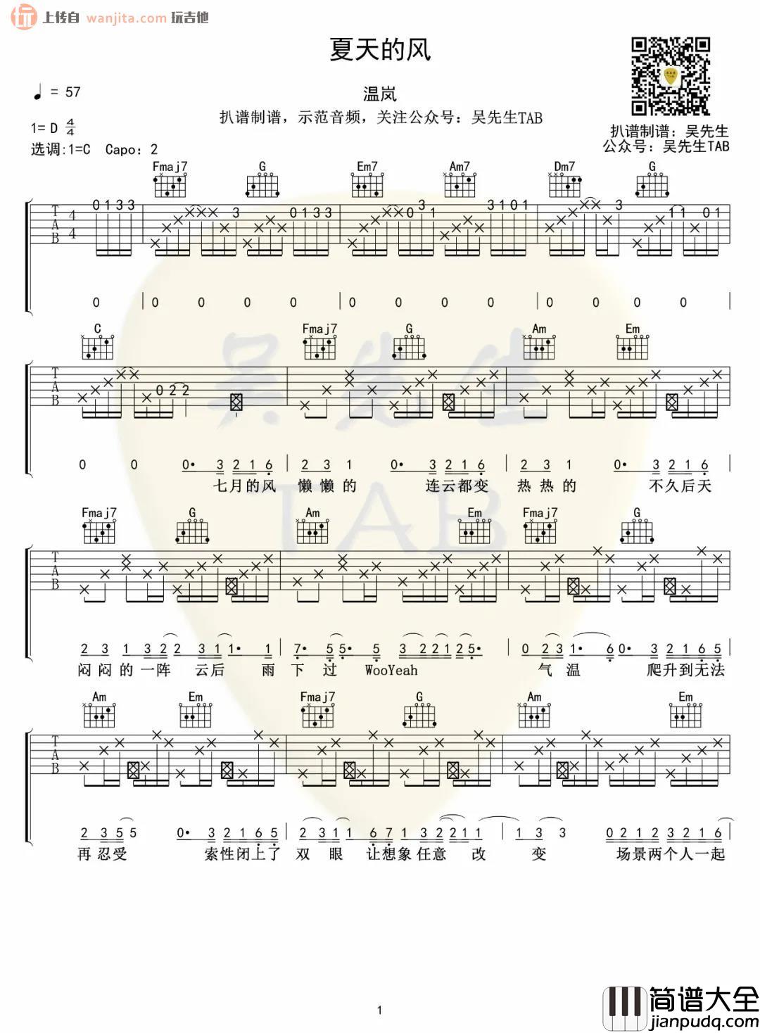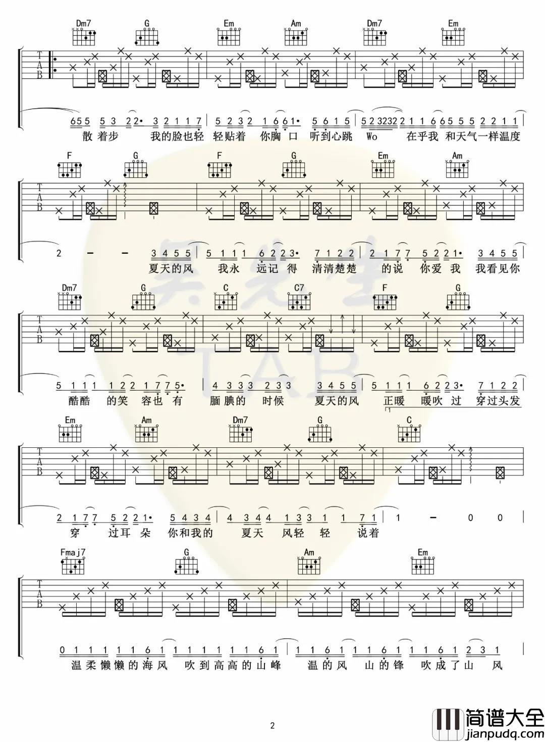 夏天的风吉他谱,总共有4张高清图片谱,来自吴先生的制谱分享,原调是D调,选用C调编配,变调夹夹在第二品,版本编配比较完整,包含前奏、间奏、尾奏,整体弹唱起来很接近原版,而且搭配拍弦的节奏,可以弹出很温馨甜蜜的感觉。