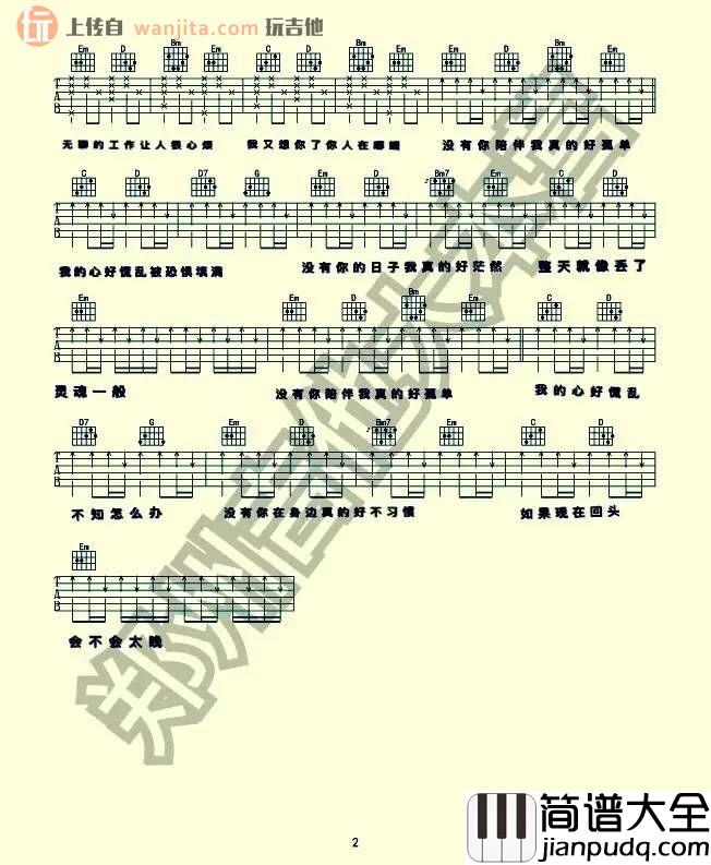 《没有你陪伴我真的好孤单》吉他谱,总共2张高清图片谱,原调为G调,节拍4/4拍,不使用变调夹,弹唱难度初级。