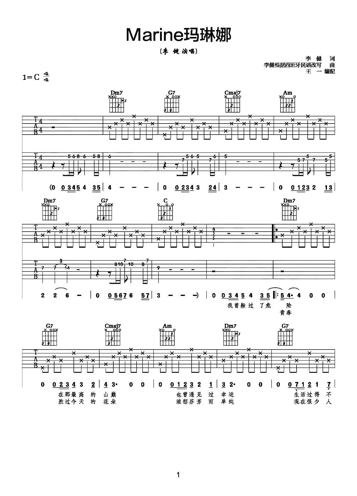 公众号:绵羊乐谱 这首《Marine马琳娜》总共3张高清图片谱,选用C调指法,由指弹中国编配制谱,弹唱难度不算大,还原度比较高,建议大家可以参考下方的演示视频结合练习。 《Marine马琳娜》吉他弹唱演示视频 公众号:绵羊乐谱 | 官方QQ群:978773290 不吃独食,学会分享!本文链接:http://www.shaomingyang.com/btb/30489.html 转载请标明出处,尊重原创(๑╹◡╹)ノ。如信息有误或版权疑问,请通过网站底部联系我们会第一时间处理,感谢理解支持(◕ᴗ◕✿)!