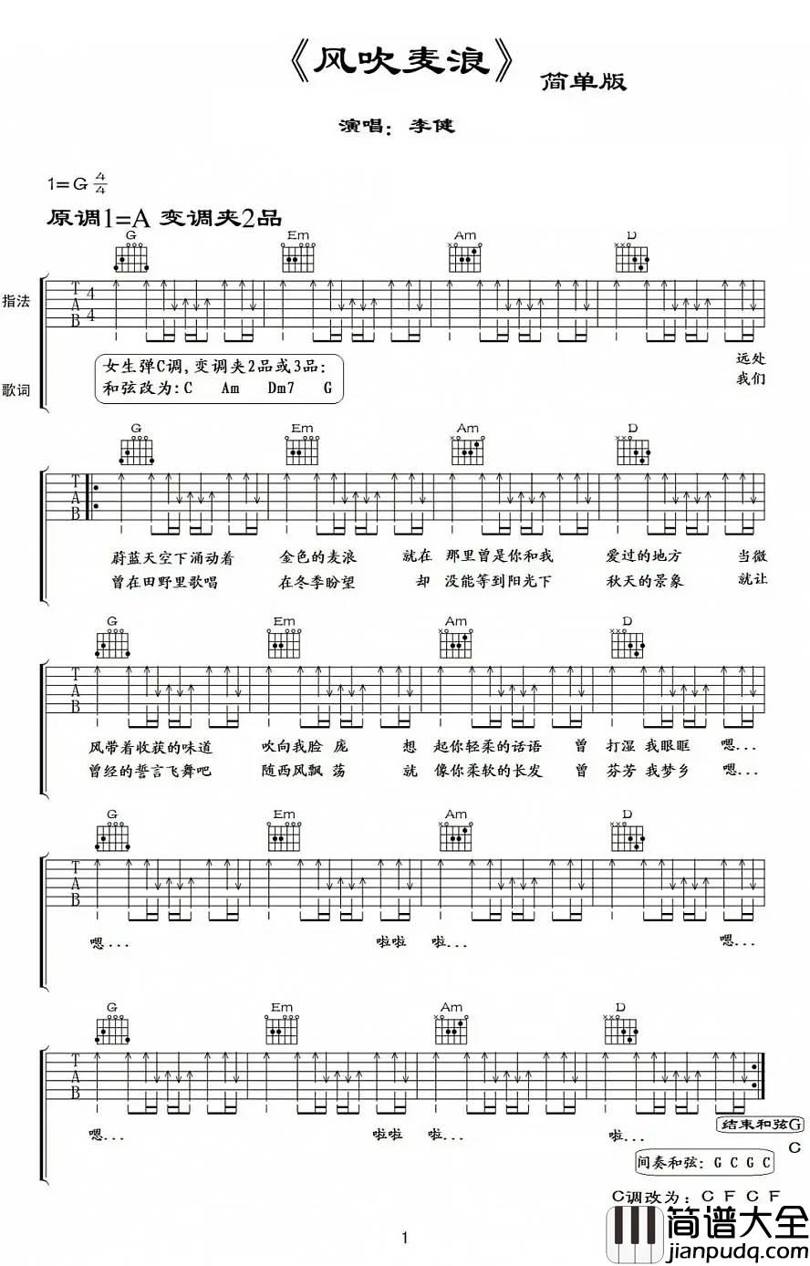 李健,孙俪《风吹麦浪》吉他谱,总共1张高清图片谱,本谱为G调吉他弹唱谱,原调A调,变调夹夹2品处,节拍4/4拍,不使用变调夹,弹唱难度初级。