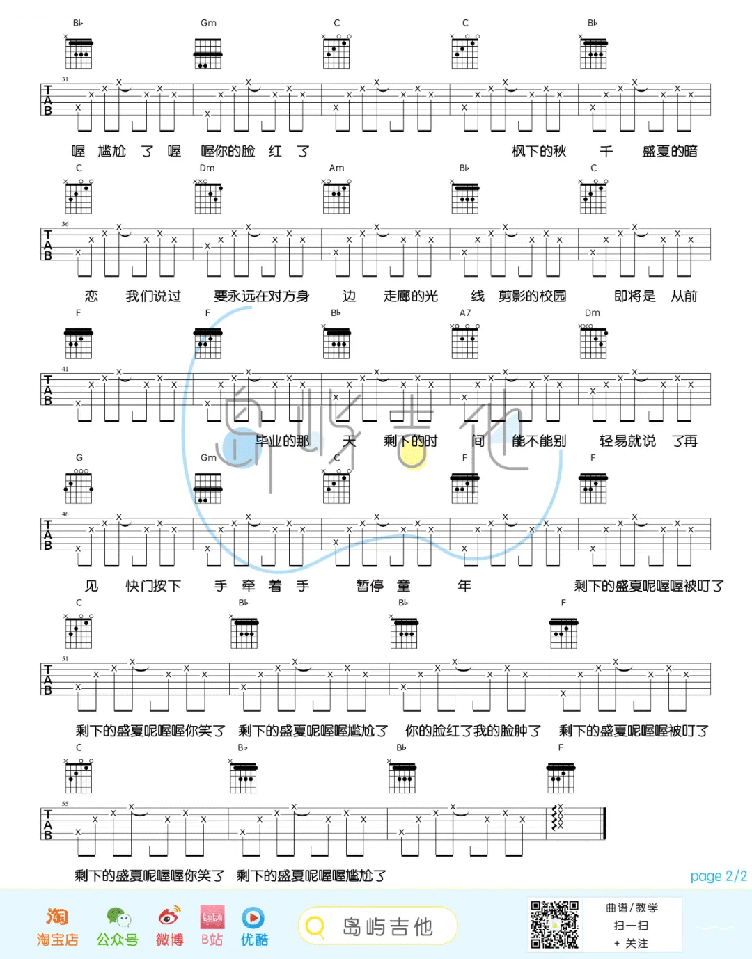 公众号:绵羊乐谱 这首曲谱总共2张高清图片谱,由岛屿吉他编配制谱,原调是E调,选用F调指法,男生需要降半音调弦弹唱原调,女生可以将变调夹夹在3-4品处弹唱原调,整体弹唱难度很简单,适合新手练习。 公众号:绵羊乐谱 | 官方QQ群:978773290 不吃独食,学会分享!本文链接:http://www.shaomingyang.com/btb/30554.html 转载请标明出处,尊重原创(๑╹◡╹)ノ。如信息有误或版权疑问,请通过网站底部联系我们会第一时间处理,感谢理解支持(◕ᴗ◕✿)!