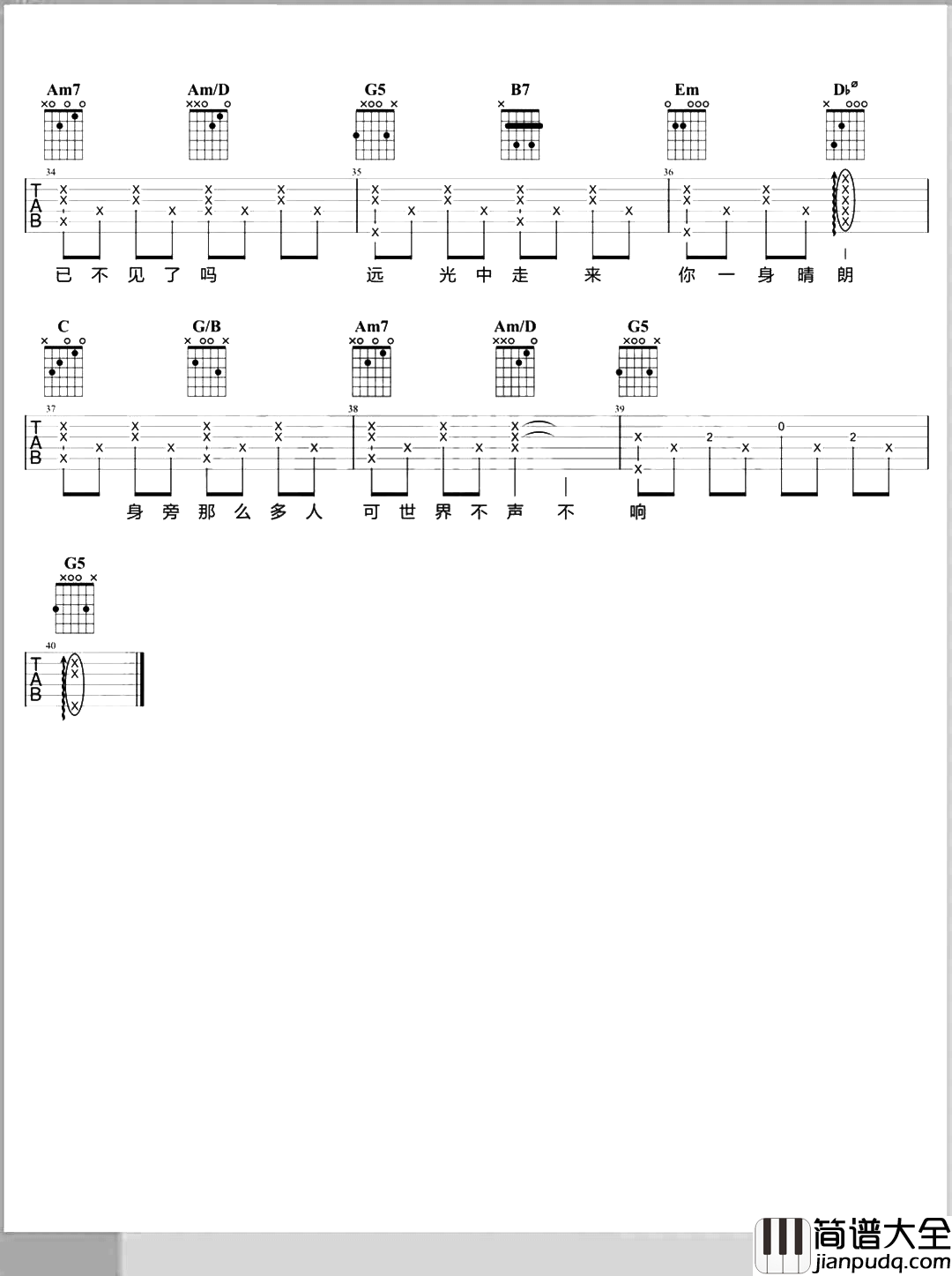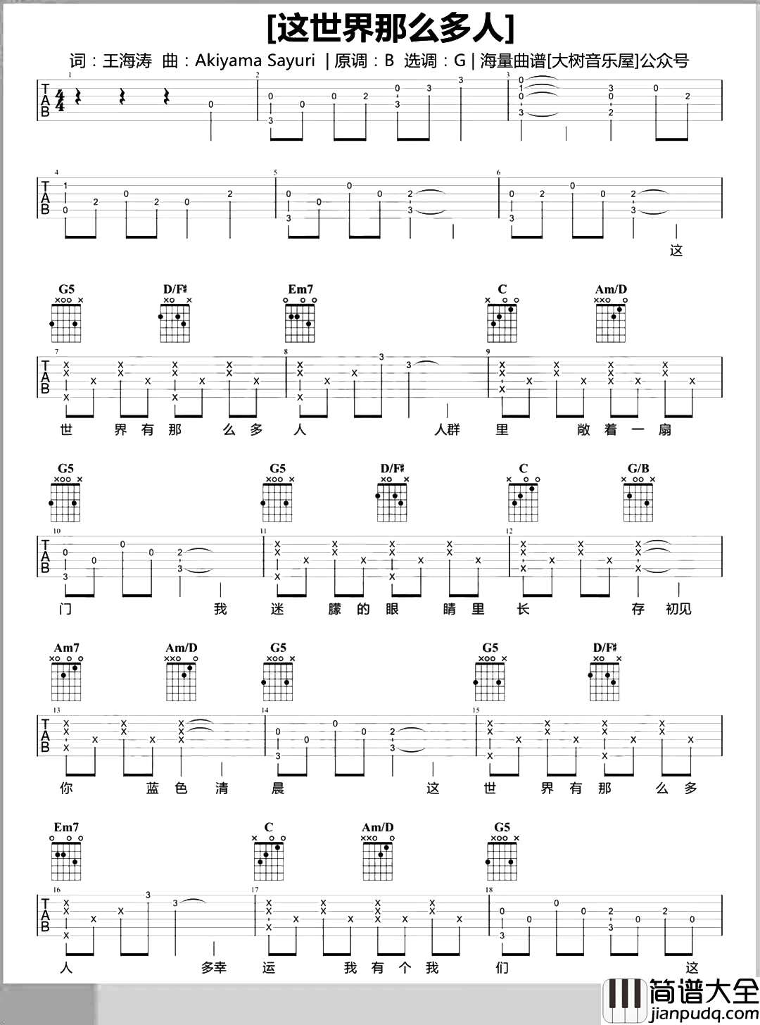公众号:绵羊乐谱 《这世界那么多人》吉他弹唱演示视频 这首曲谱,原调是B调,选用G调指法,唱原调可以夹4品,男生可以夹5-6品,低8度演唱即可,感谢大树音乐屋编配制谱,总共3张高清图片谱,这首歌曲本身的弹唱难度不算大,之前也有其他几个版本大家可以根据自己的需要和习惯选择适合自己的弹唱版本。 公众号:绵羊乐谱 | 官方QQ群:978773290 不吃独食,学会分享!本文链接:http://www.shaomingyang.com/btb/30577.html 转载请标明出处,尊重原创(๑╹◡╹)ノ。如信息有误或版权疑问,请通过网站底部联系我们会第一时间处理,感谢理解支持(◕ᴗ◕✿)!