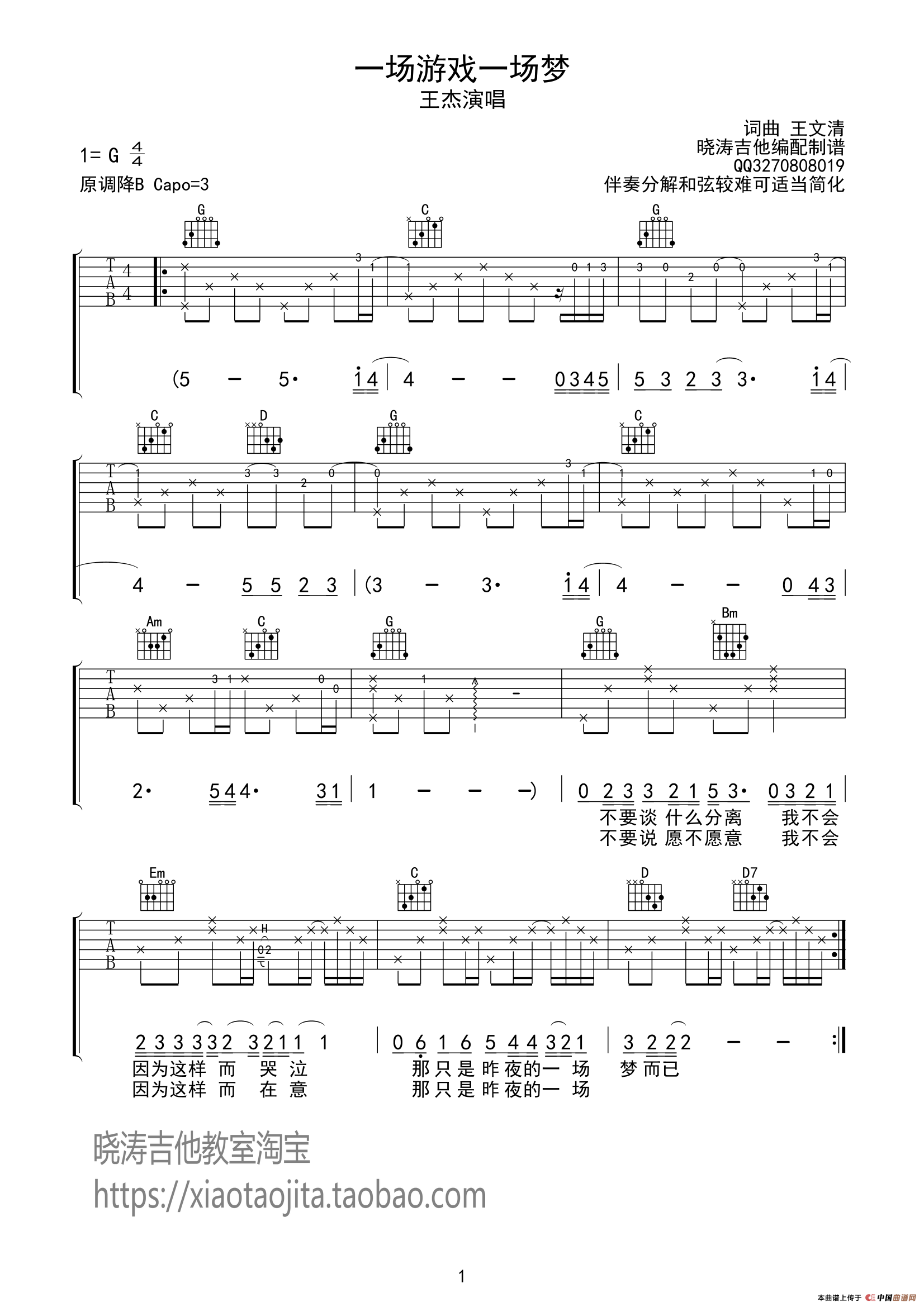 王杰《一场游戏一场梦》吉他谱-图1