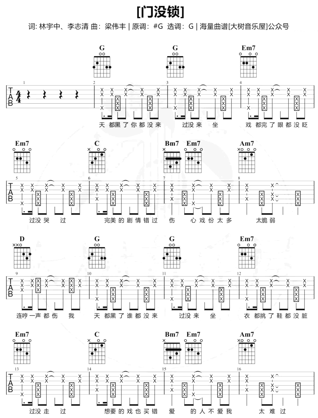 公众号:绵羊乐谱 品冠的一首让人疯狂上头的老歌,《门没锁》已经过去那么多年,竟然被小黄同学翻成了魔性音乐。门没锁吉他谱,选调G,男生如果想唱原调可以变调夹夹一品,女生弹唱建议夹四品。共四张图片六线谱。 公众号:绵羊乐谱 | 官方QQ群:978773290 不吃独食,学会分享!本文链接:http://www.shaomingyang.com/btb/30637.html 转载请标明出处,尊重原创(๑╹◡╹)ノ。如信息有误或版权疑问,请通过网站底部联系我们会第一时间处理,感谢理解支持(◕ᴗ◕✿)!