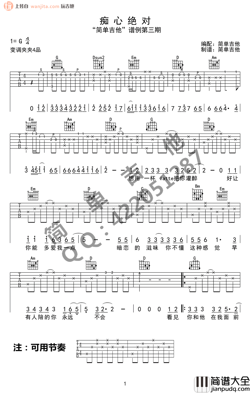 公众号:绵羊乐谱 《痴心绝对》吉他谱_G调原版六线谱_吉他弹唱谱,选用G调指法,变调夹可以夹4品,由于原版的音域偏高,大家可以根据自己的音域情况选择合适的变调夹位置,这首曲谱由简单吉他提供分享,玩吉他整理上传。 公众号:绵羊乐谱 | 官方QQ群:978773290 不吃独食,学会分享!本文链接:http://www.shaomingyang.com/btb/30643.html 转载请标明出处,尊重原创(๑╹◡╹)ノ。如信息有误或版权疑问,请通过网站底部联系我们会第一时间处理,感谢理解支持(◕ᴗ◕✿)!