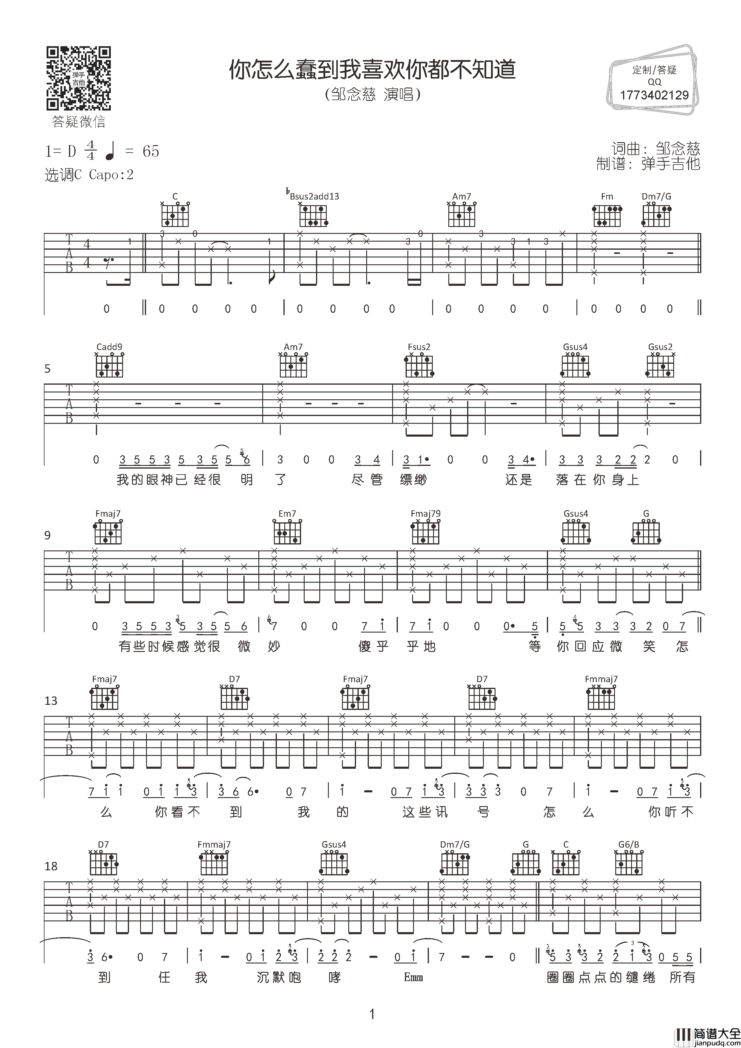 你怎么蠢到我喜欢你都不知道吉他谱,原曲是由邹念慈作词作曲并演唱的一首舒缓情歌,节奏舒缓而治愈。《你怎么蠢到我喜欢你都不知道》弹唱谱总共3张高清图片谱,由弹手吉他编配制谱,原调是D调,选用C调指法,变调夹夹2品可以弹唱原调,节拍每分钟65拍,大家可以试着练习。