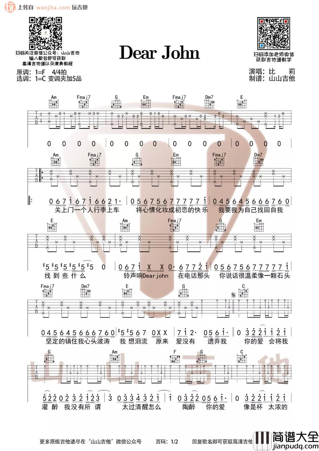 《Dear John》吉他谱,原调是F调,选用C调指法,变调夹夹5品弹唱原调,这首歌比较完整前奏部分和主歌部分,以分解和弦为主,其余都以扫弦弹唱。大家可以参考这首歌的吉他弹唱视频再练习。