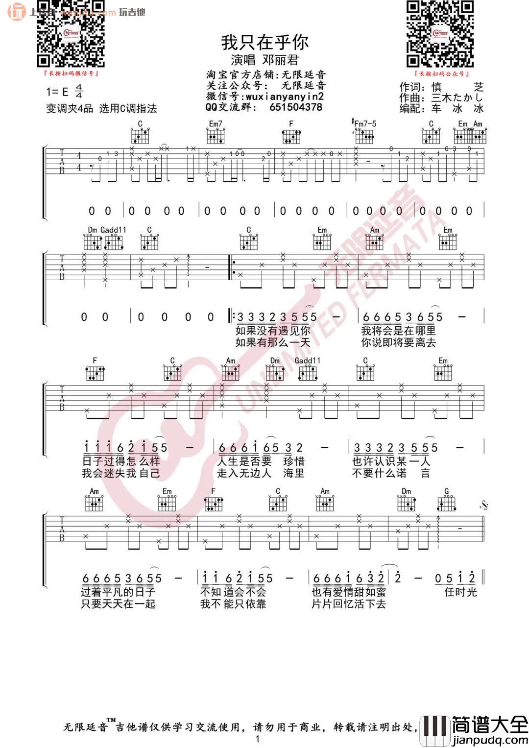 《我只在乎你》吉他谱,由无限延音制谱,原调E调,选用C调指法,变调夹夹4品即可弹唱这首歌曲原调,曲谱包含了完整的前奏,喜欢的可以练习弹唱哦。