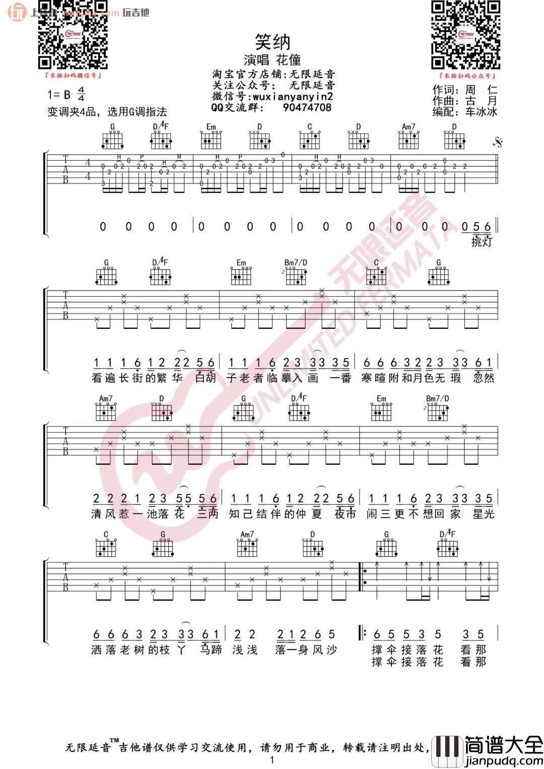 《笑纳》吉他谱由无限延音制谱,原调是B调,选用G调指法编配,歌曲包含了完整的前奏部分,主副歌弹唱难度不大,喜欢的朋友不要错过。