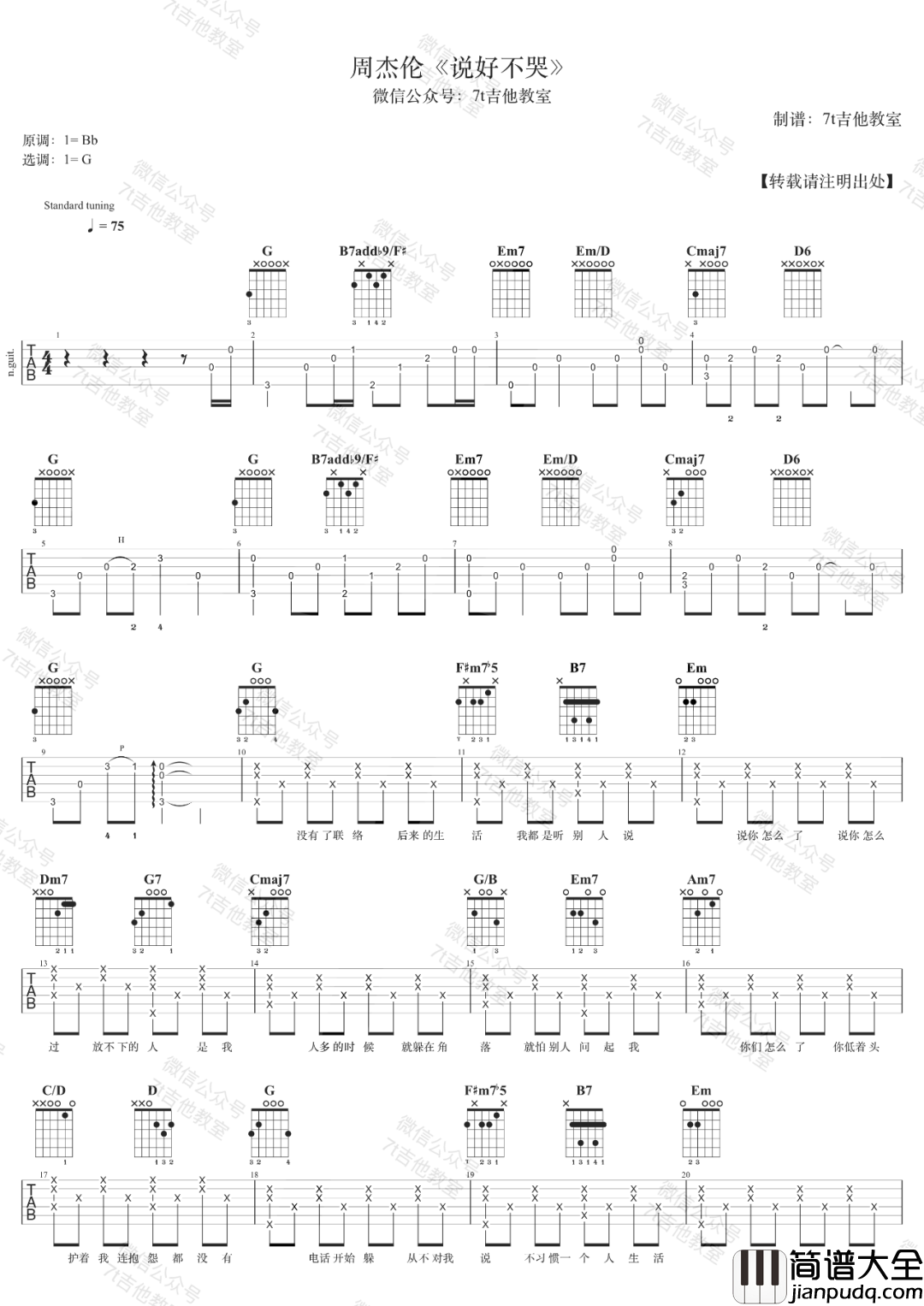 《说好不哭》吉他谱这首歌的原调是Bb大调,这个版本是G大调的指法来编配,视频里是标准音调弦,没有使用变调夹,适合音域较低的男生。说好不哭是周杰伦去年和阿信共同演唱的歌曲,受到广大歌迷的喜爱,这个版本的编配还是比较简单,除了前奏部分需要好好练习一下,后面的节奏处理都是比较规律的,