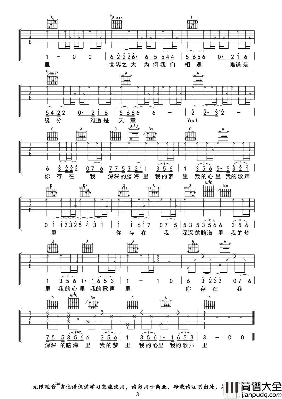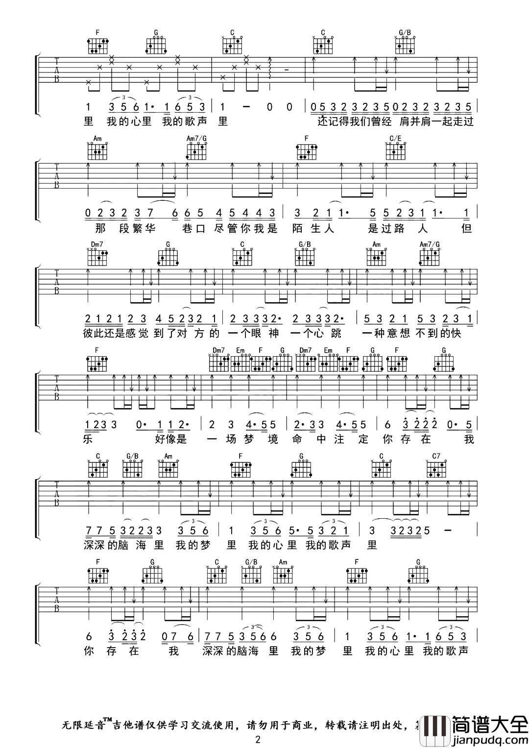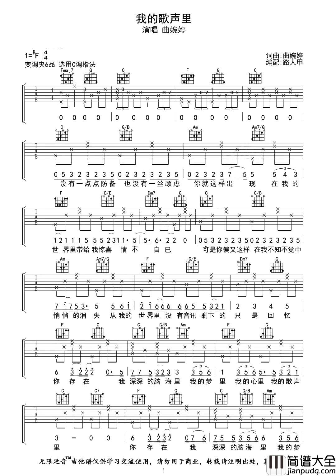 《我的歌声里》吉他谱原调是#F调,由无限延音选用C调指法编配,女声如果弹唱的线品选择,根据自己的音域而定,这个版本难度不算大,包含了简单的前奏部分,比较适合新手弹唱和练习。