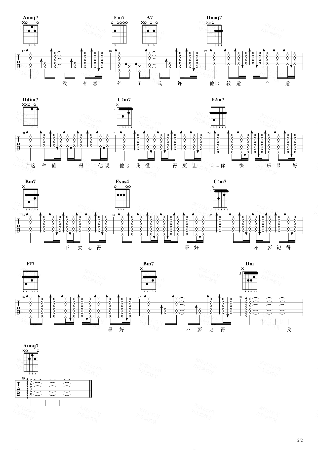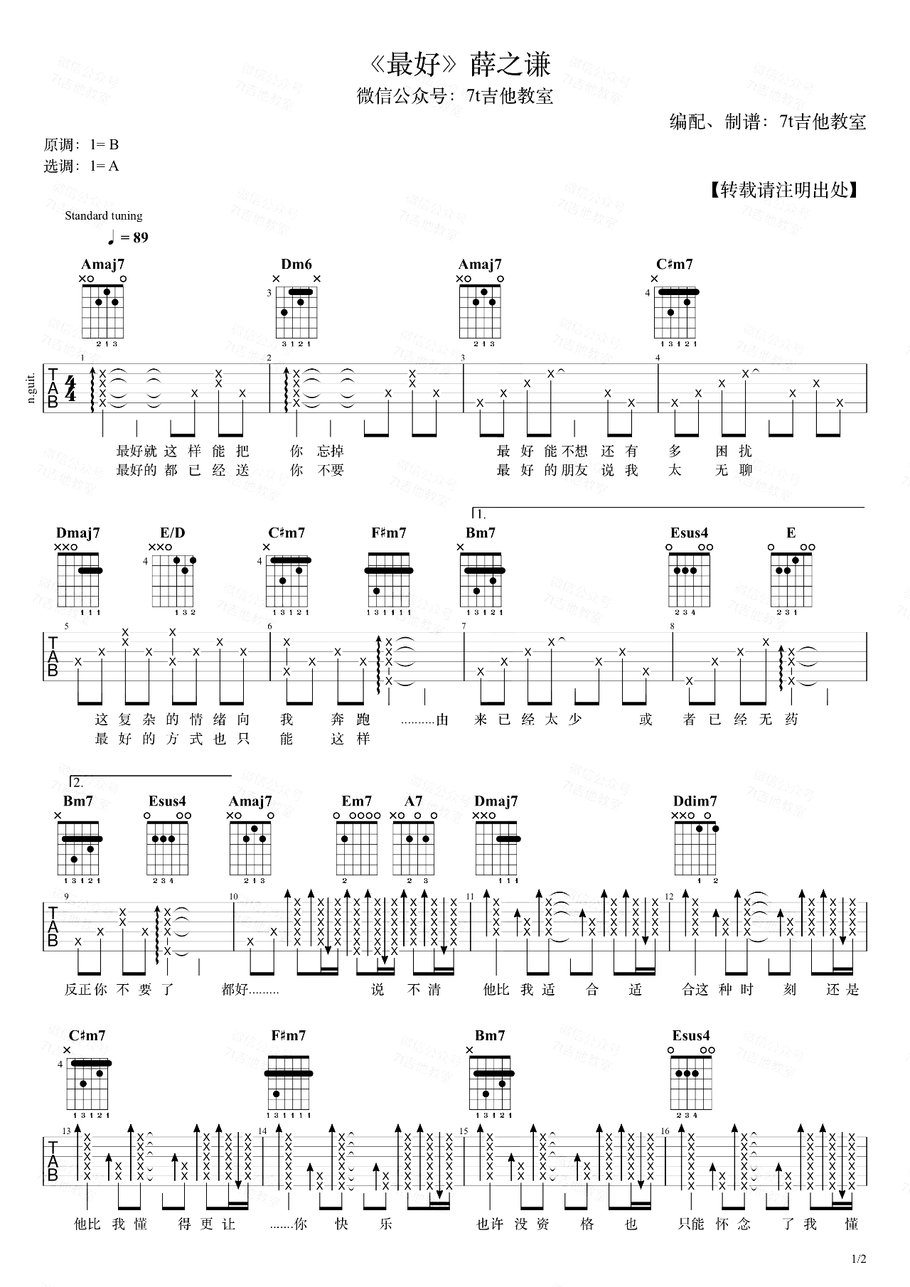 薛之谦最好吉他谱,由7T吉他教室制谱,总共2张高清图片谱,本谱为A调吉他弹唱谱,原调是B调,大家可以根据自己音域调整变调夹位置,版本完全按原版编配,弹唱难度较简单,可先参考下方《最好》吉他弹唱演示视频。