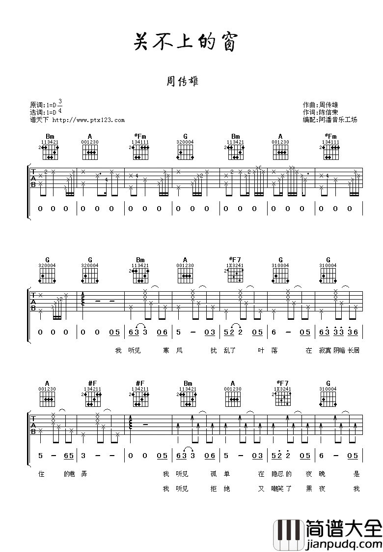 由阿潘音乐工场制谱的《关不上的窗》吉他谱,周传雄演唱,选用D调指法,《关不上的窗》吉他弹唱谱,共两张高清图片谱例,节奏3/4拍,可不用变调夹弹唱原调D调,难度初级。