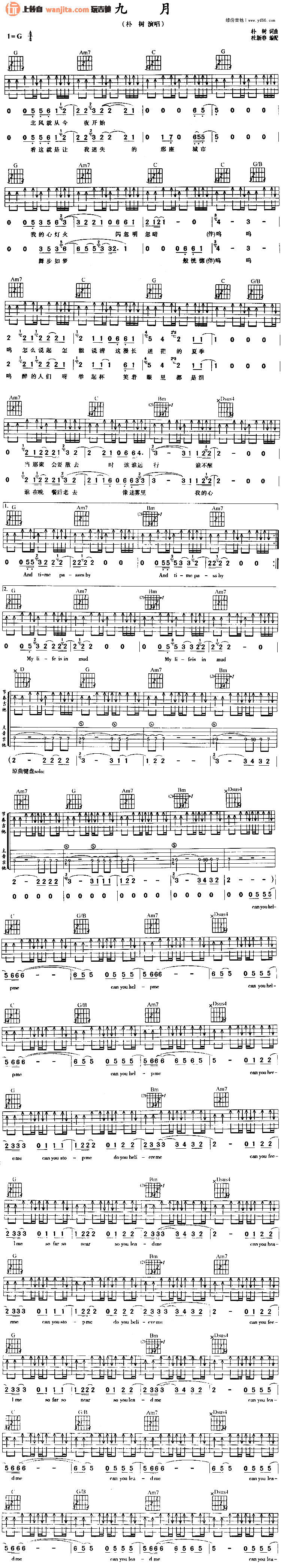 朴树《九月》吉他谱,总共1张高清图片谱,选用G调指法,节拍4/4拍,不使用变调夹,弹唱难度初级。
