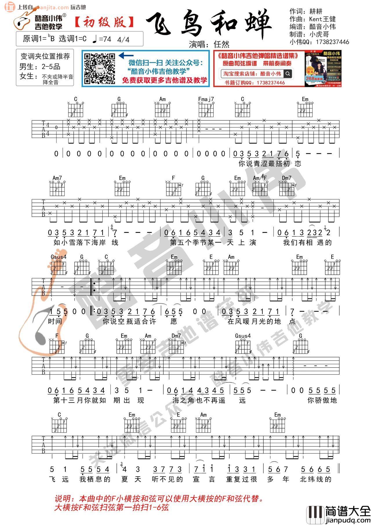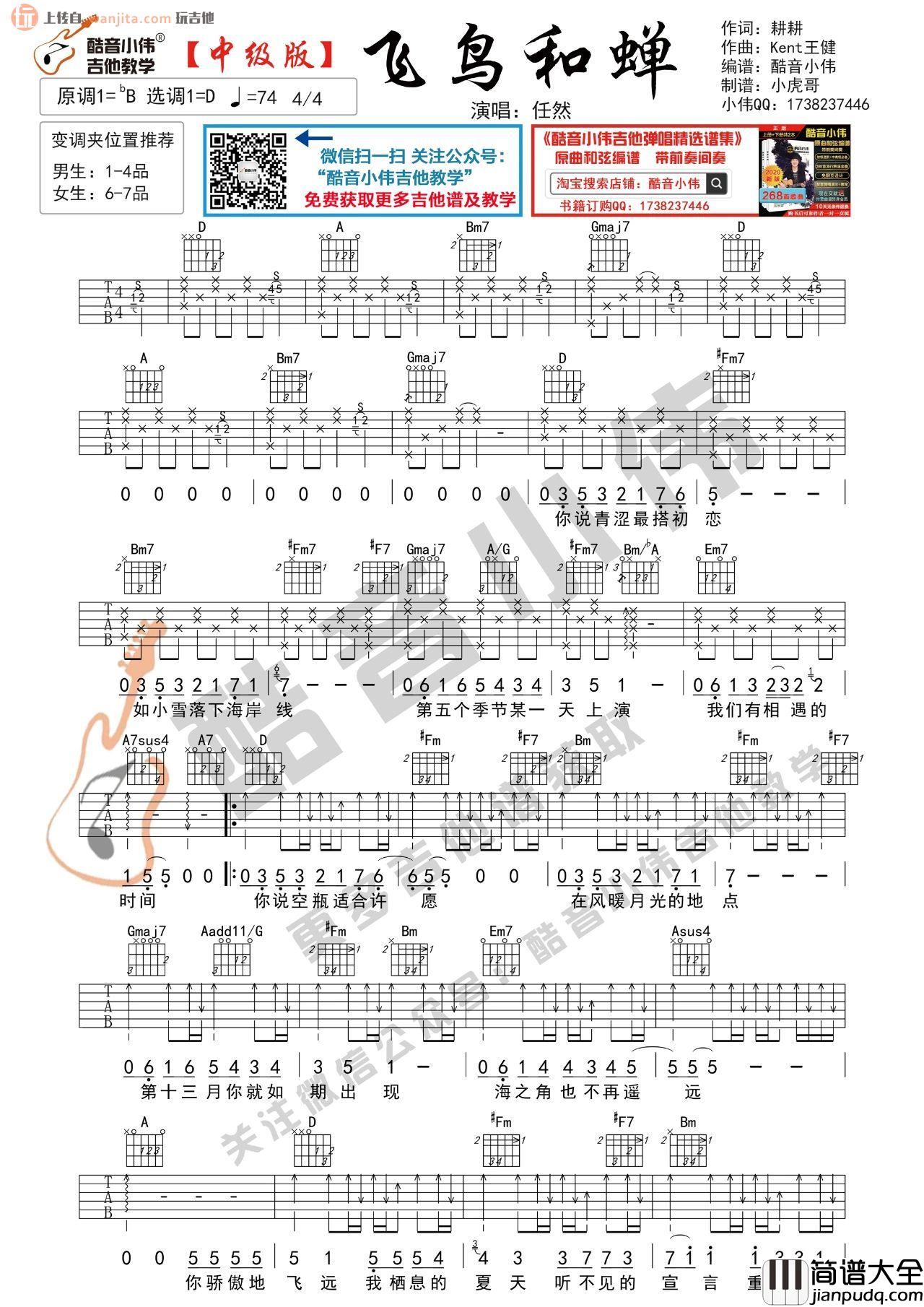 《飞鸟和蝉》吉他谱,由酷音小伟编配分享,这个谱子输出了D调中级版和C调初级版两个版本,供大家选择,下方的视频弹唱部分是针对中级版进行的演示,歌曲基本上按原版来编配,之前玩吉他的小编老师已经更新过好几个版本,各有各的味道,喜欢的朋友也可以参考上方的这首歌的其他谱子版本进行练习。