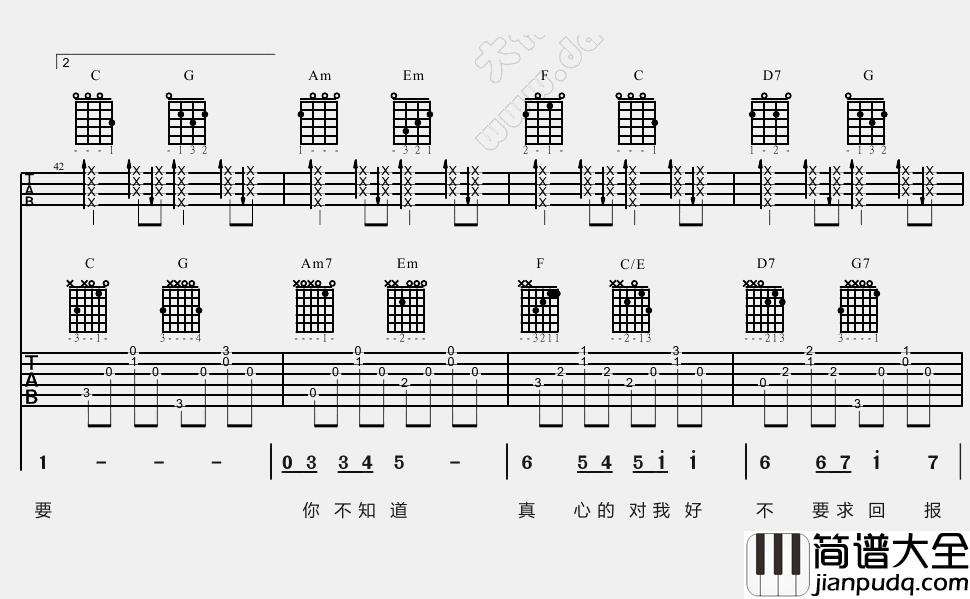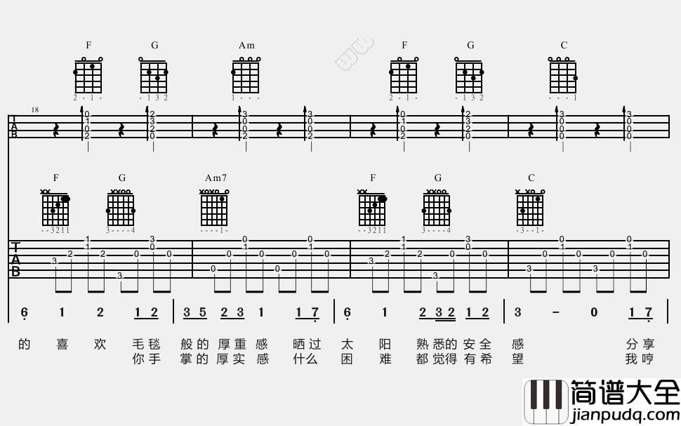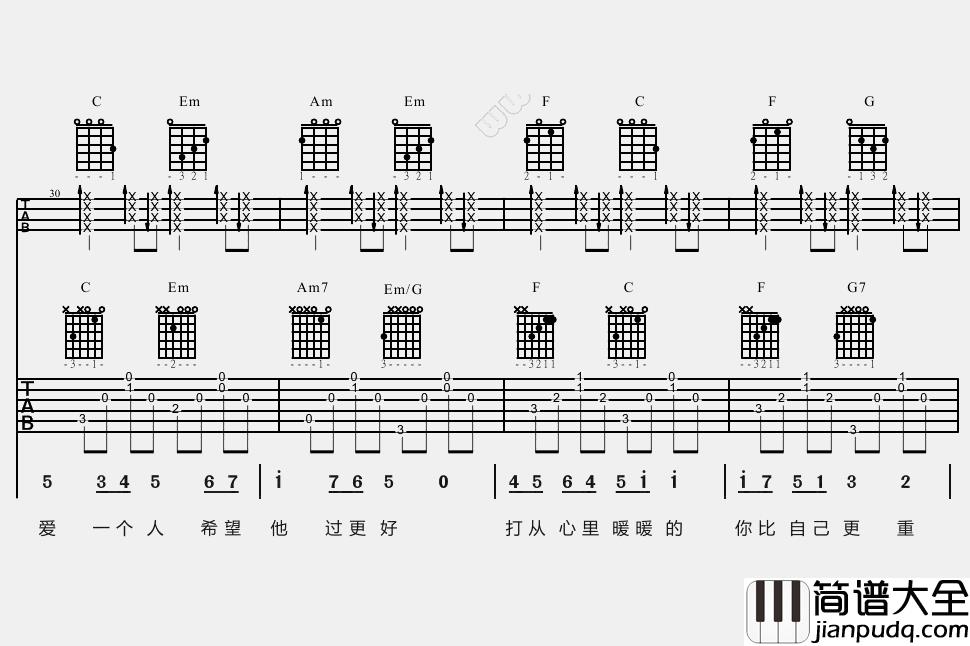 暖暖吉他谱,由大伟吉他编配,总共11张高清图片谱,包含了吉他谱和尤克里里谱两种弹唱标注,这首歌非常适合吉他弹唱,建议大家可以参考这首歌曲的吉他弹唱演示视频,不过自行练习也不难。