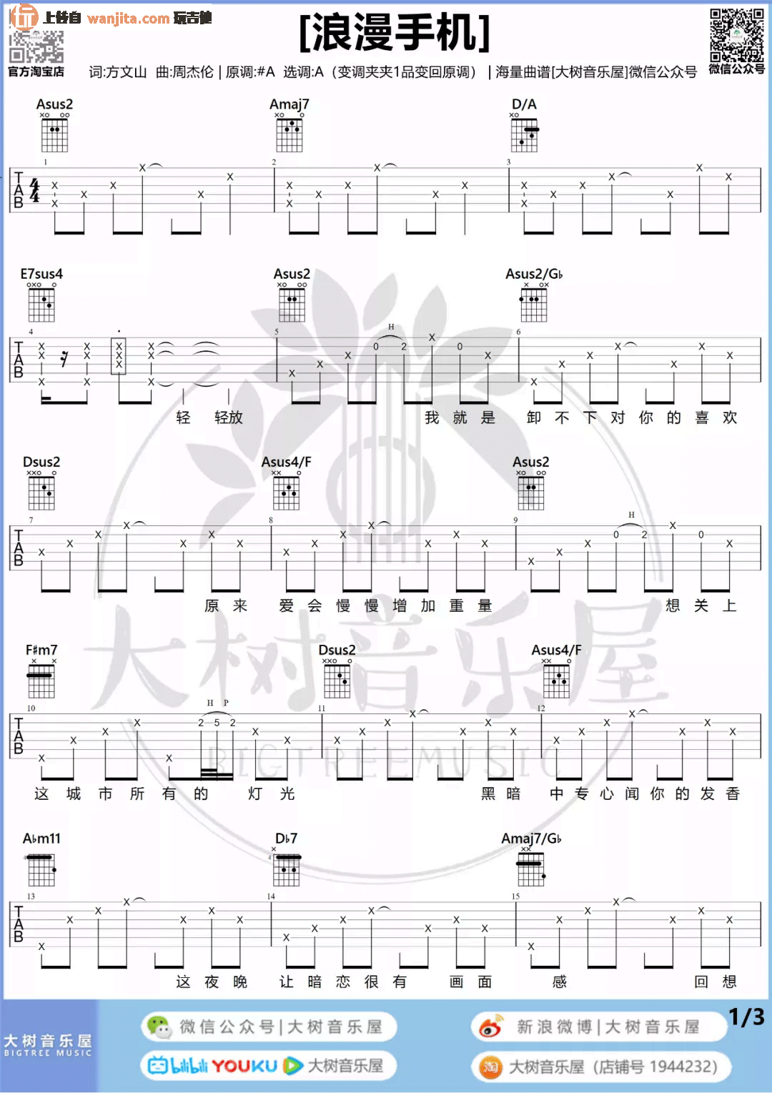 公众号:绵羊乐谱 《浪漫手机》吉他弹唱谱,由大树音乐屋制谱,总共3张高清图片谱,弹唱难度适中,其中还提供了歌曲的完整教学视频,大家练习的时候可以先参考教学视频。同时这首歌中主要的味道还是来自于拍弦的节奏型,也许面对这样的甜蜜小品,这样的节奏会让跳动的旋律更加有味道! 《浪漫手机》吉他弹唱教学视频 公众号:绵羊乐谱 | 官方QQ群:978773290 不吃独食,学会分享!本文链接:http://www.shaomingyang.com/btb/30769.html 转载请标明出处,尊重原创(๑╹◡╹)ノ。如信息有误或版权疑问,请通过网站底部联系我们会第一时间处理,感谢理解支持(◕ᴗ◕✿)!