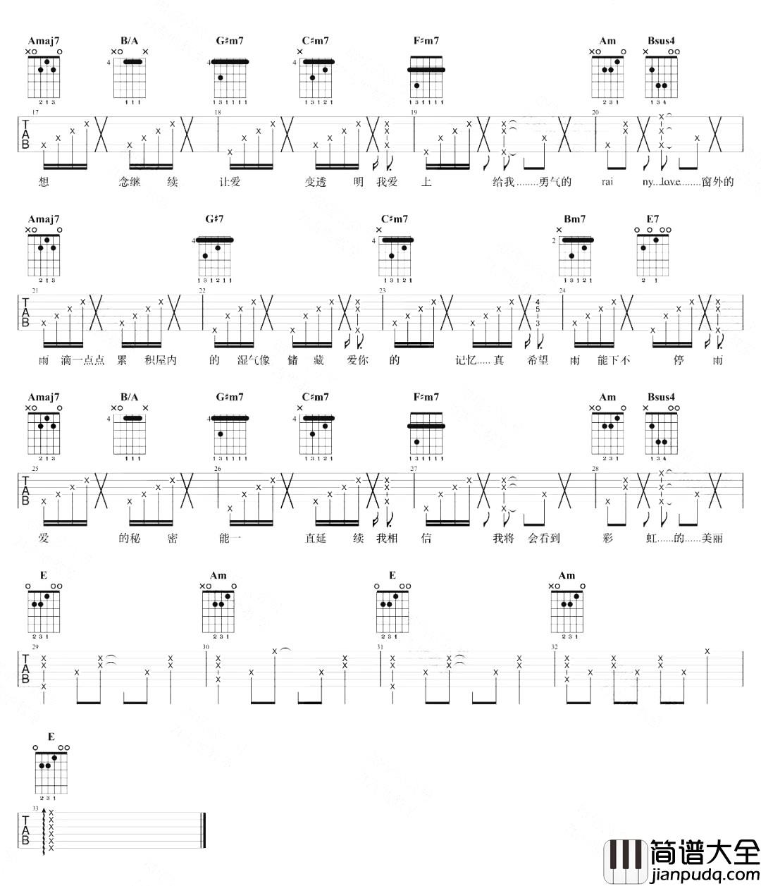 公众号:绵羊乐谱 雨爱是杨丞琳的一首代表歌曲之一,这首歌的原调是E大调,谱子用的也是E大调的指法来编配,视频里是标准音调弦,没有用变调夹,适合音域较高的女生演唱。音域较低的男生可以弹我之前出的一个版本,后面的视频演唱示范是适合女生唱的版本,节奏型也有所改动哦~感谢蜜汁叉烧肠示范演唱。 公众号:绵羊乐谱 | 官方QQ群:978773290 不吃独食,学会分享!本文链接:http://www.shaomingyang.com/btb/30833.html 转载请标明出处,尊重原创(๑╹◡╹)ノ。如信息有误或版权疑问,请通过网站底部联系我们会第一时间处理,感谢理解支持(◕ᴗ◕✿)!