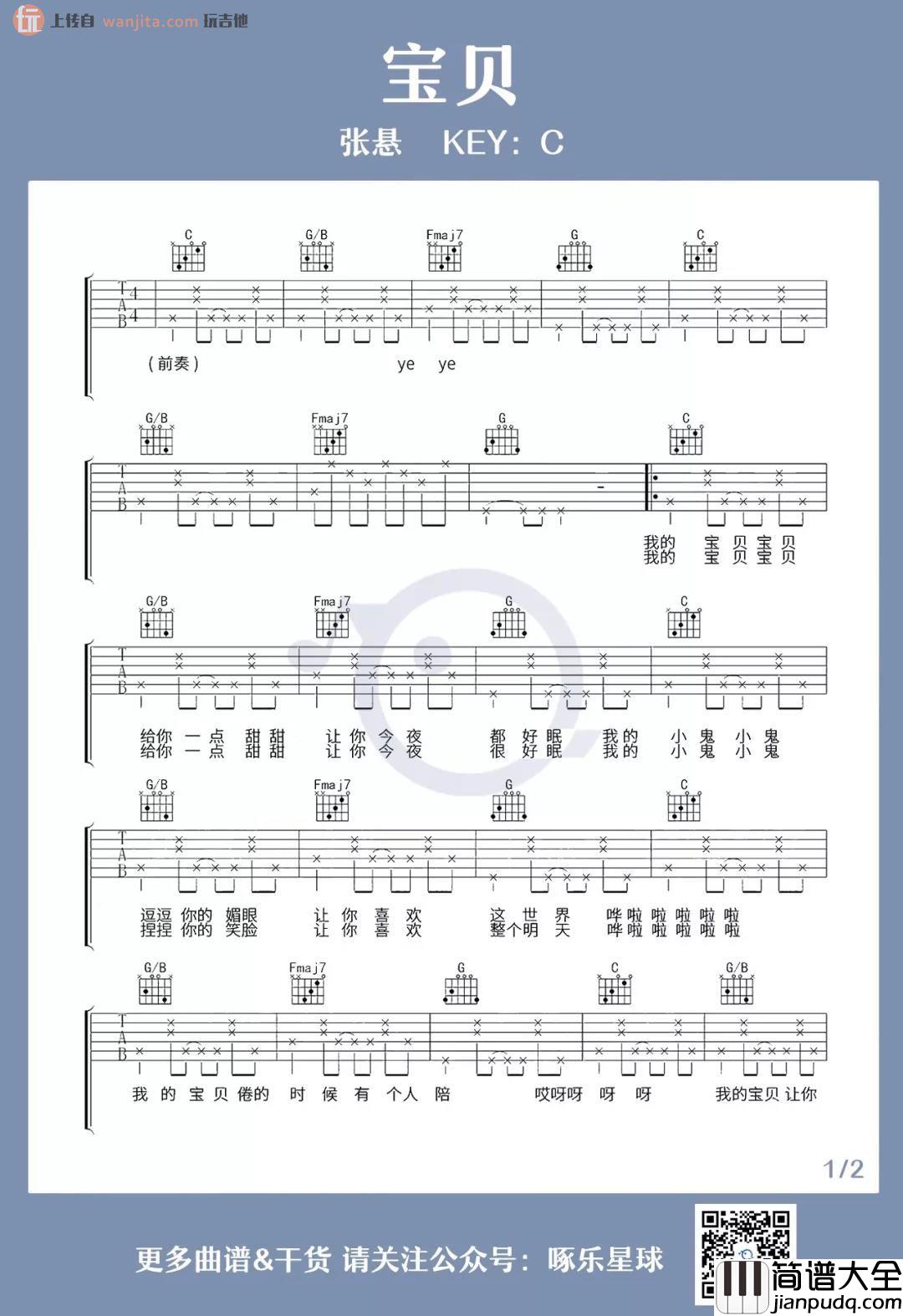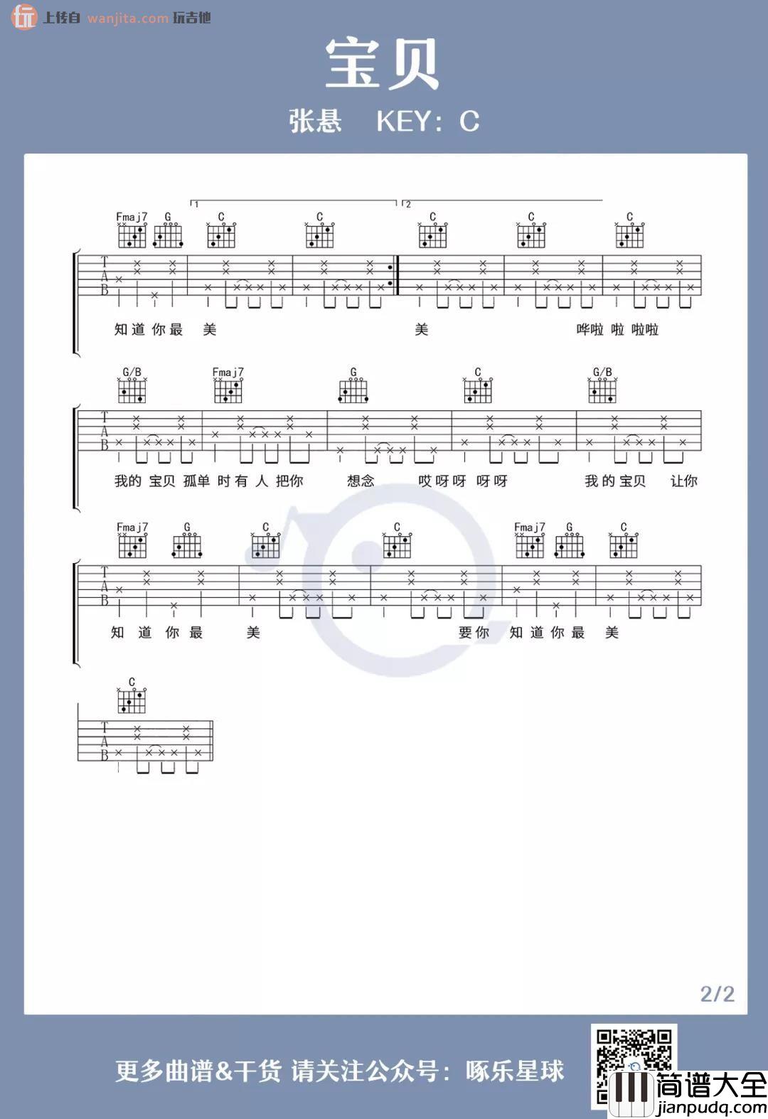 张悬《宝贝》吉他谱,这首歌曲是选用C调指法编配,弹唱很简单,前奏和主调部分编配和原版保持一致,所以是一首非常适合新手练习谱子,喜欢的朋友收下这个谱子,赶紧试弹一下吧!
