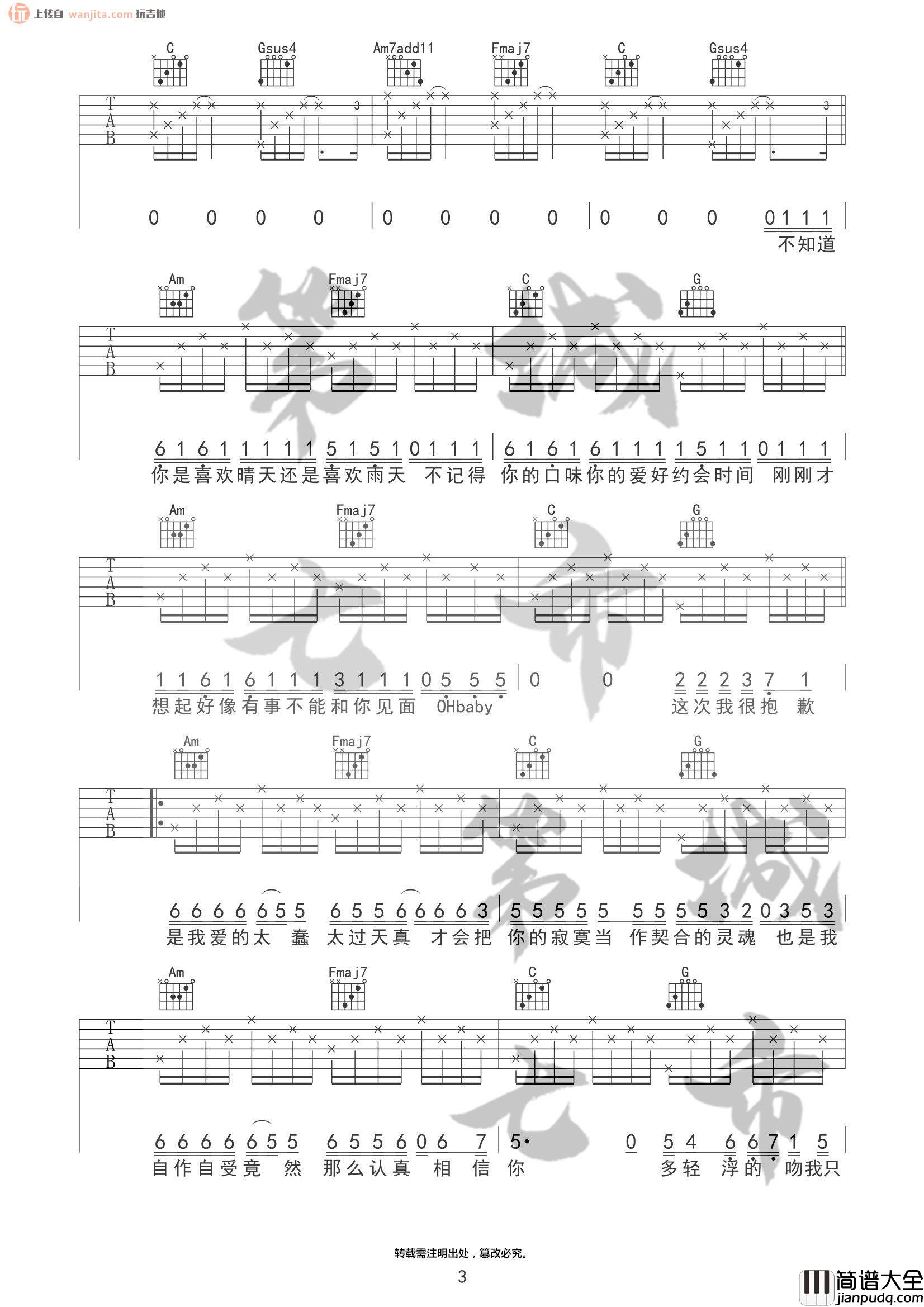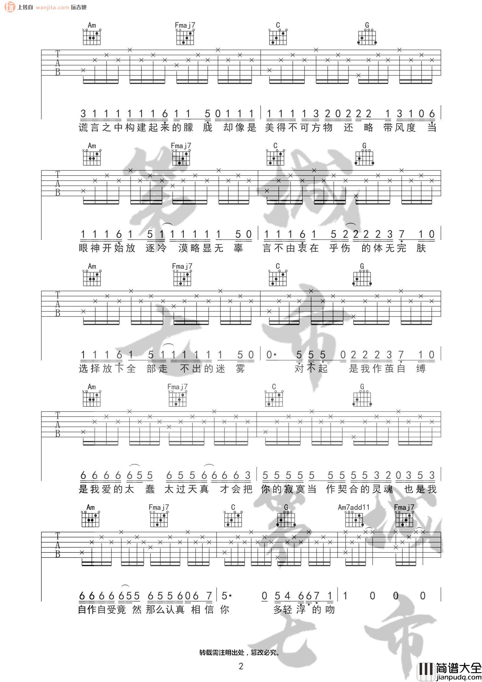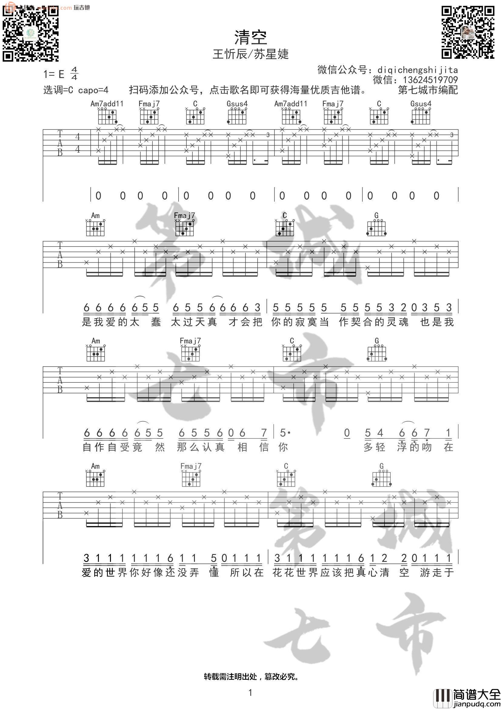 清空C调六线张高清图片谱,变调夹夹4品可以弹唱原调,难度适中,主要以分解和弦的方式弹唱,曲风温柔,喜欢的朋友不要错过哦。感谢第七城市编配制谱并演示试听音频。