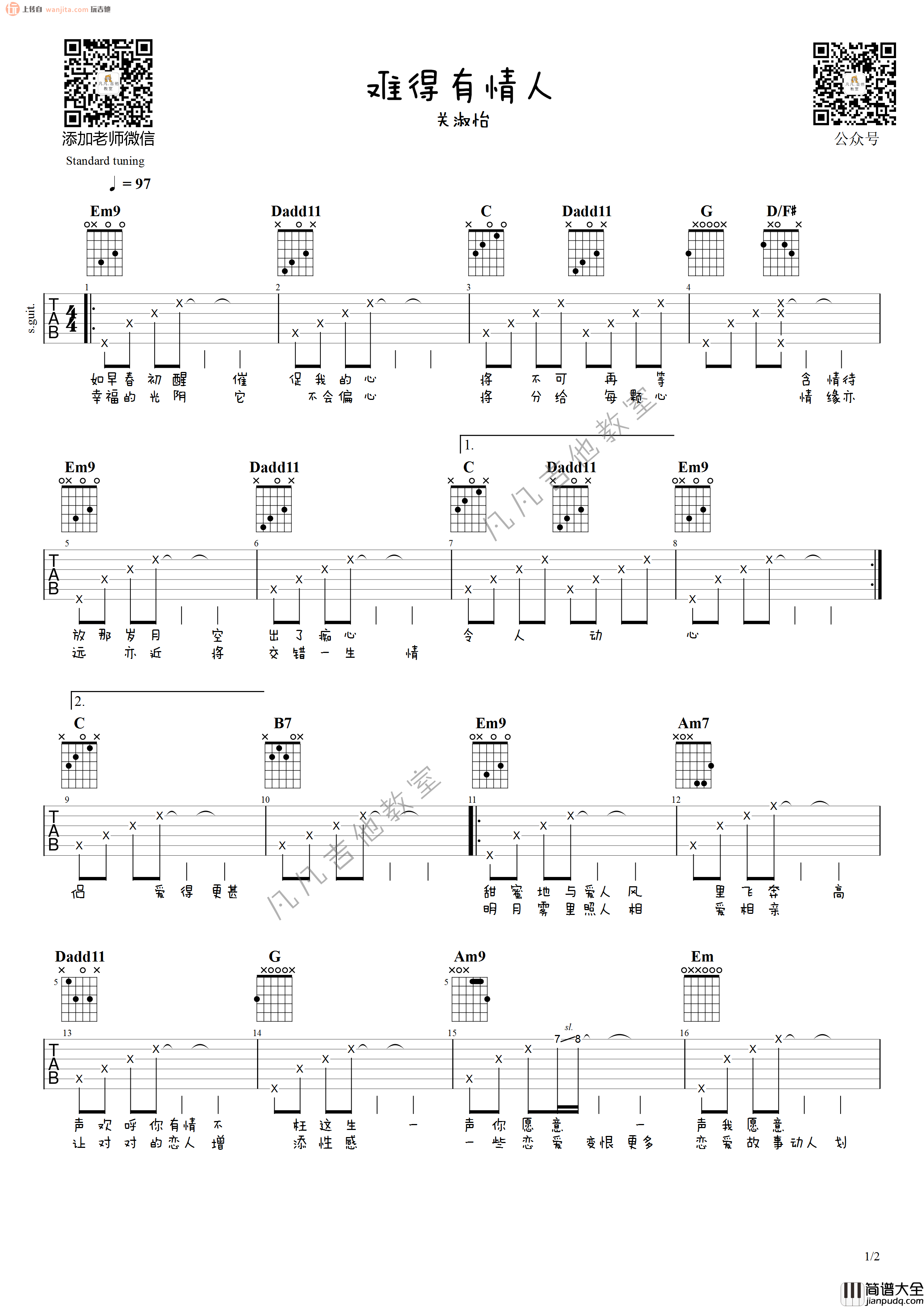 《难得有情人》吉他谱,选用E调指法编配,这首谱子总共2张高清图片谱,非常简单抒情的弹唱版本,难度不大,喜欢的朋友可以试试。