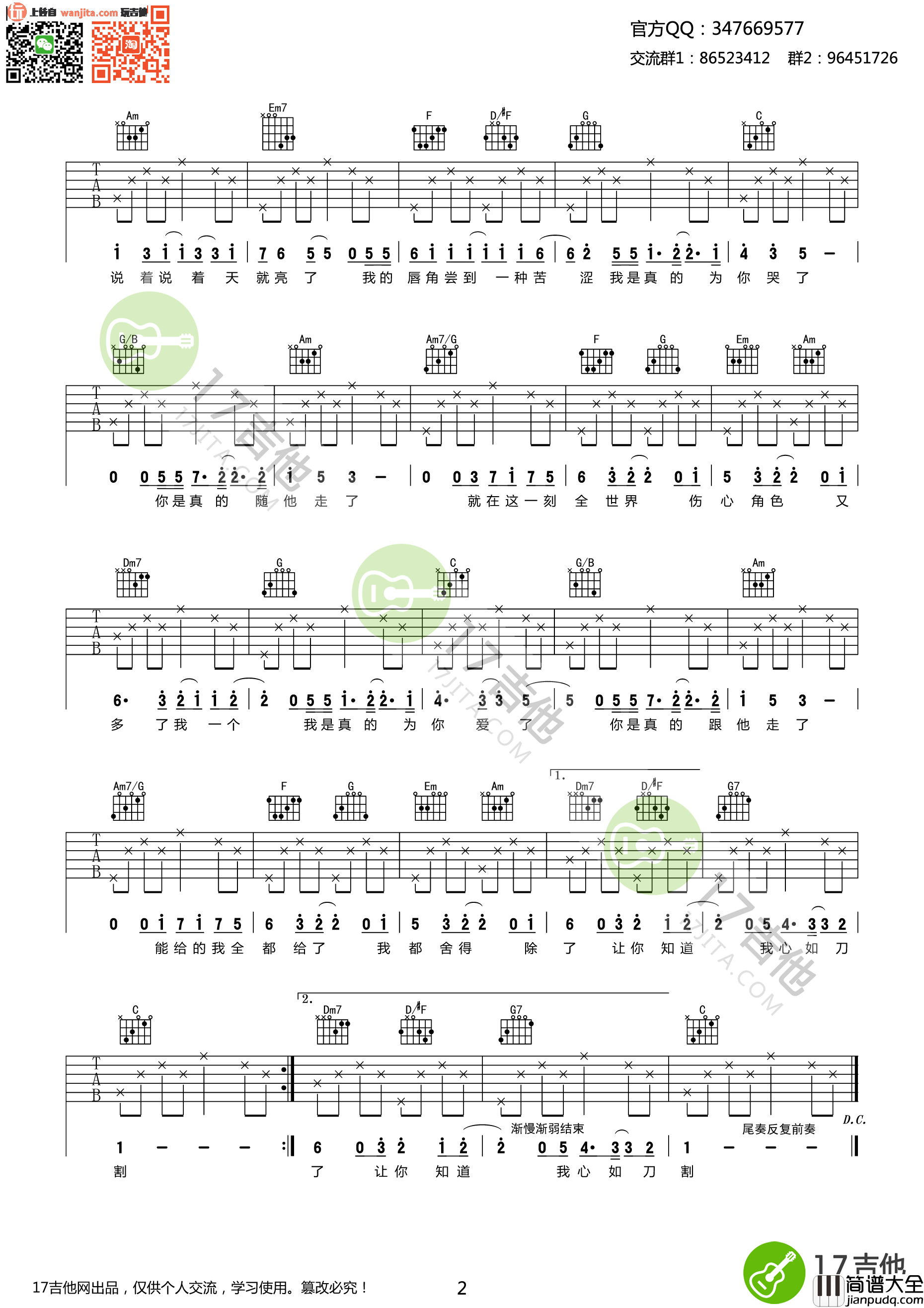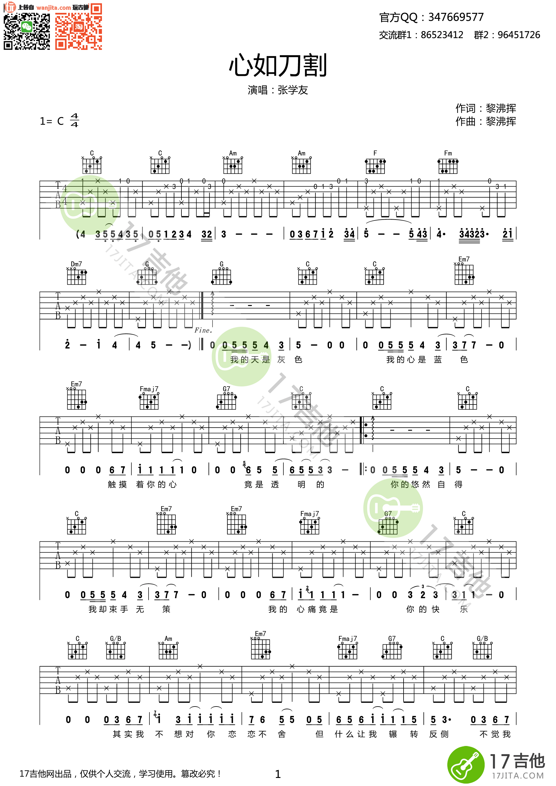《心如刀割》吉他谱【高清弹唱谱】,总共2张高清图片谱,选用C调指法,节拍4/4拍,不使用变调夹,弹唱难度初级。