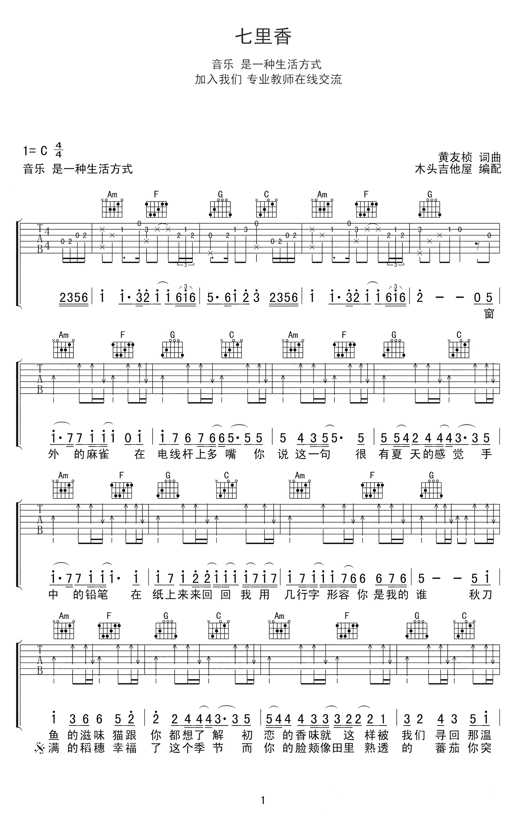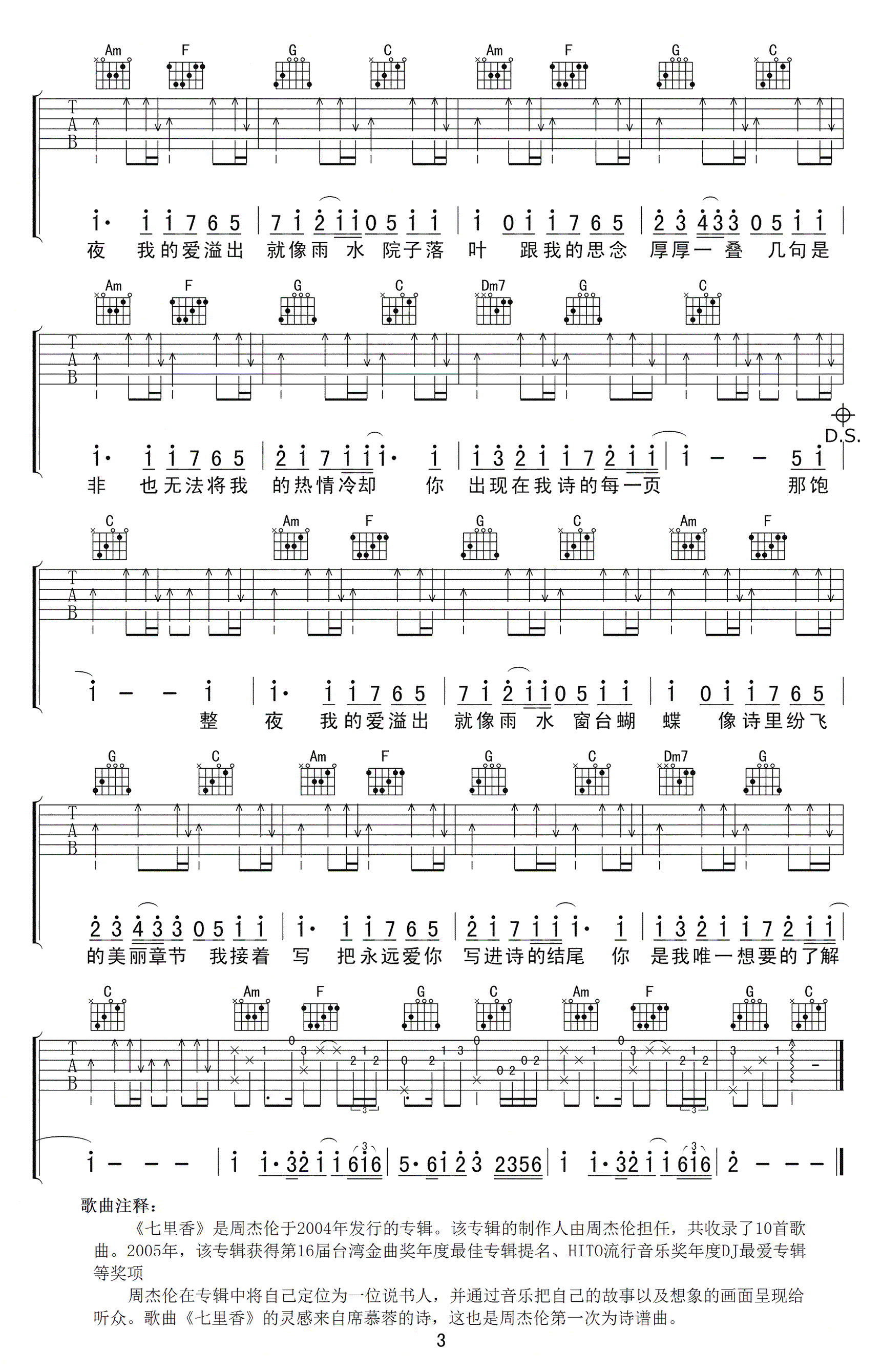 周杰伦的经典作品,曾经的一首风靡校园的初恋神曲。七里香吉他谱,选用C调指法编配,《七里香》吉他弹唱谱,三张高清图片谱例。