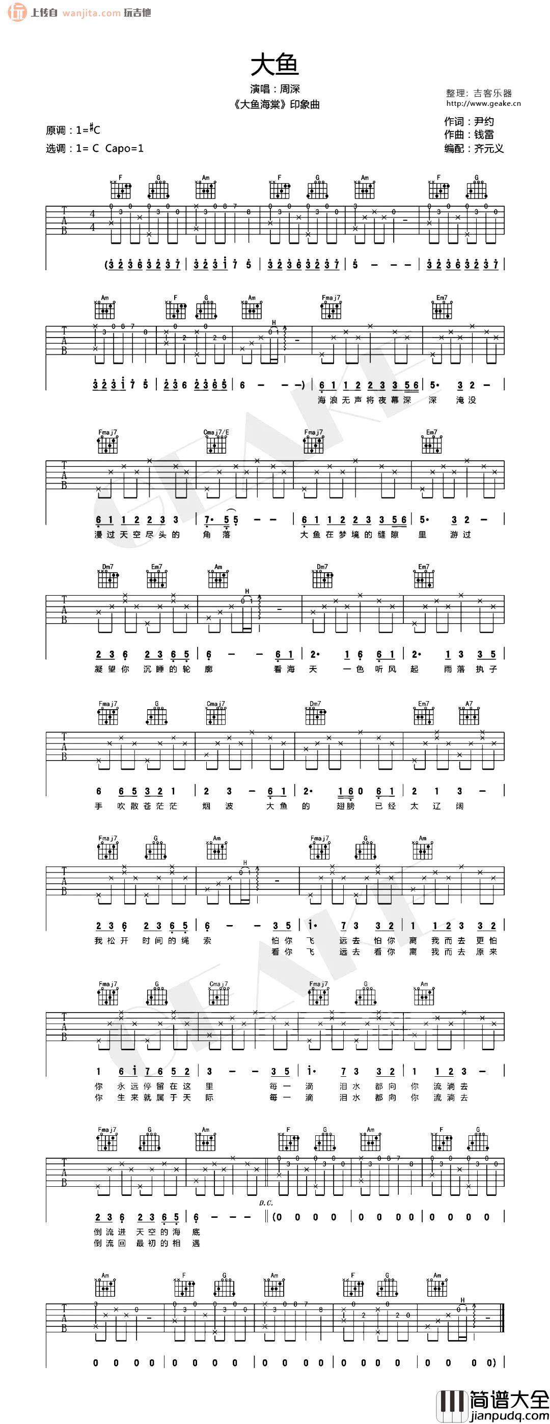 《大鱼》吉他谱,原调#C,选用C调,不使用变调夹。齐元义编配。整首曲谱包含了完整的前奏和间奏,吉他的演绎更为贴合歌词意境,非常适合吉他弹唱的一首歌曲,曲谱比较简单,适合初学者学习练习。