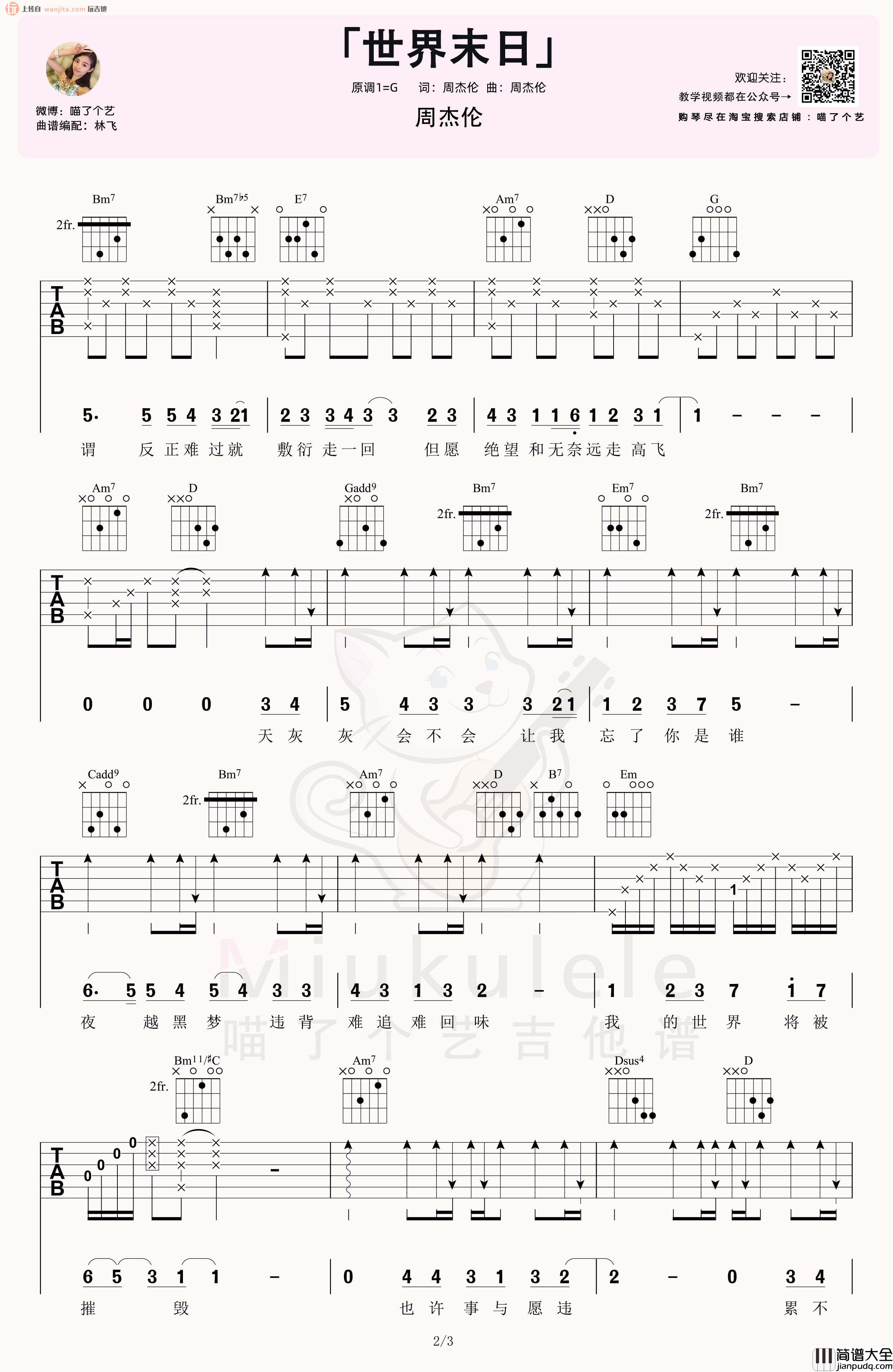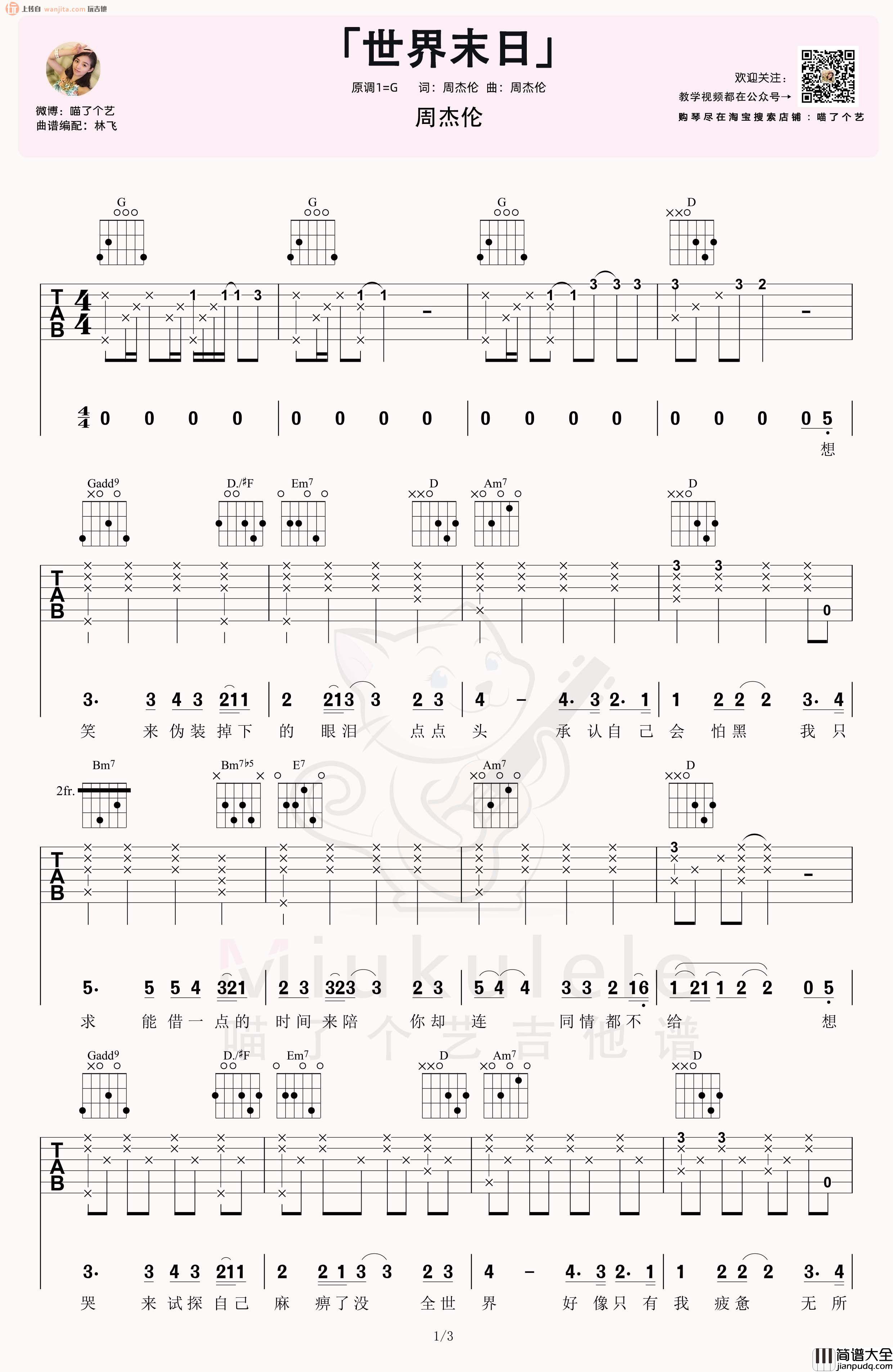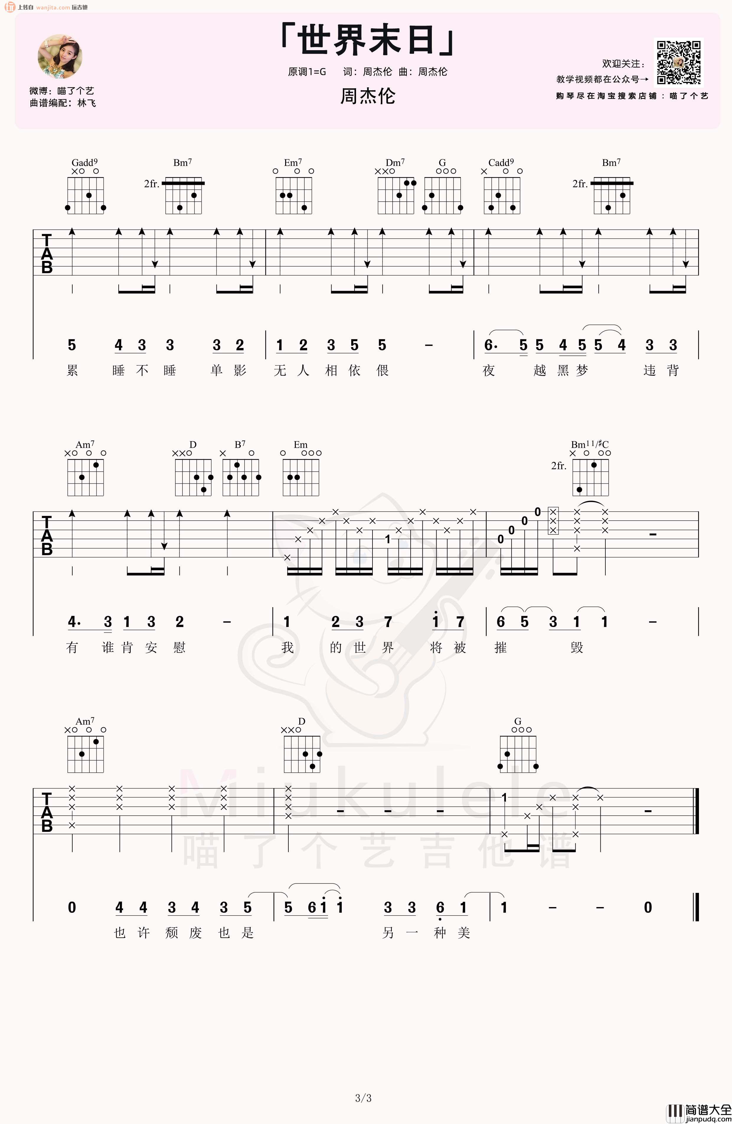 《世界末日》吉他谱,原调是G调,包含了完整前奏,弹唱难度适中,其实主要需要练好前奏部分,其余的都不需要花太多的时间即可以拿下,感兴趣的朋友建议大家可以参考喵了个艺所弹奏的演示视频。
