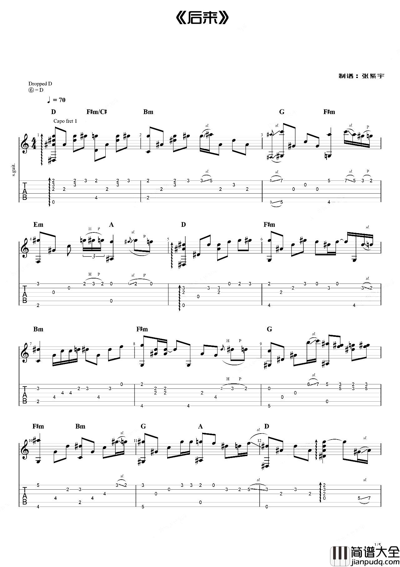 《后来》指弹吉他谱【付弹唱演示+教学】,本谱由张紫宇老师制谱,D调指法编配,速度70BPM,随谱附有《后来》的吉他弹唱演示+教学视频,感兴趣的朋友可以跟随老师一起练习,难度★★★☆☆。