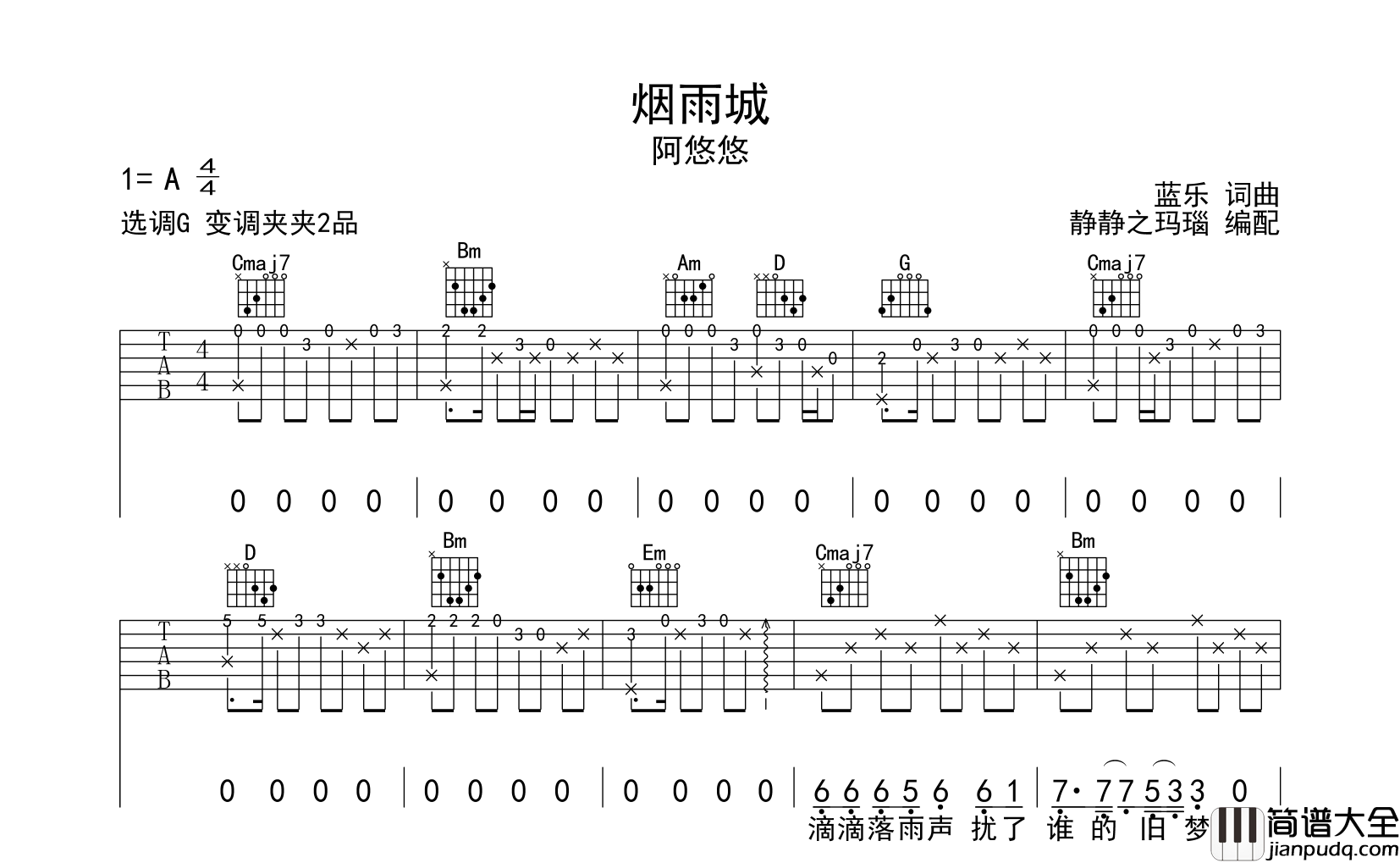 公众号:绵羊乐谱 阿悠悠《烟雨城》吉他谱,由静静之玛瑙编配制谱,共两张高清六线谱图例,本谱采用G调和弦指法编配,节奏为4/4拍,速度为80拍每分钟,弹唱建议变调夹夹2品,也可以根据个人嗓音找到一个舒服的位置,难度较简单。 公众号:绵羊乐谱 | 官方QQ群:978773290 不吃独食,学会分享!本文链接:http://www.shaomingyang.com/btb/30905.html 转载请标明出处,尊重原创(๑╹◡╹)ノ。如信息有误或版权疑问,请通过网站底部联系我们会第一时间处理,感谢理解支持(◕ᴗ◕✿)!