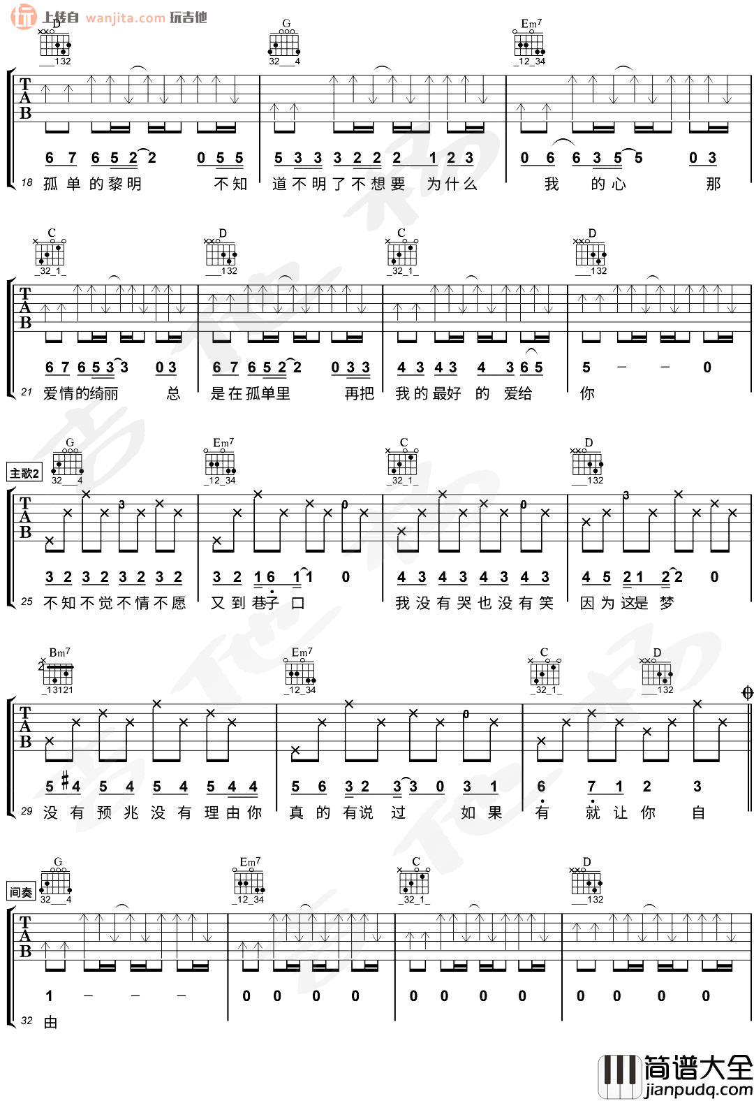公众号:绵羊乐谱 《温柔》吉他弹唱谱,总共3张高清图片谱例,由吉他杨制谱分享。选用G调,不使用变调夹。节奏强是五月天的风格,比较容易学习的节奏型,整体弹唱难度不大,参考演示视频,结合弹唱方便快速上手哦。 《温柔》吉他弹唱演示 公众号:绵羊乐谱 | 官方QQ群:978773290 不吃独食,学会分享!本文链接:http://www.shaomingyang.com/btb/30924.html 转载请标明出处,尊重原创(๑╹◡╹)ノ。如信息有误或版权疑问,请通过网站底部联系我们会第一时间处理,感谢理解支持(◕ᴗ◕✿)!