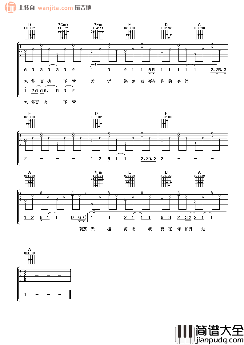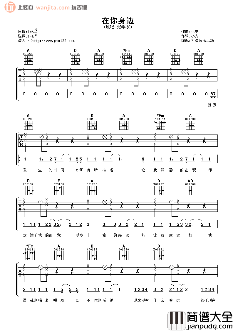 《在你身边》吉他谱,A调,阿潘音乐工场编配。这首歌曲难度属于中等,适合进阶练习,大家在学习的时候要注意这首歌的间奏和前奏,一首充满张学友对歌迷爱的歌曲。